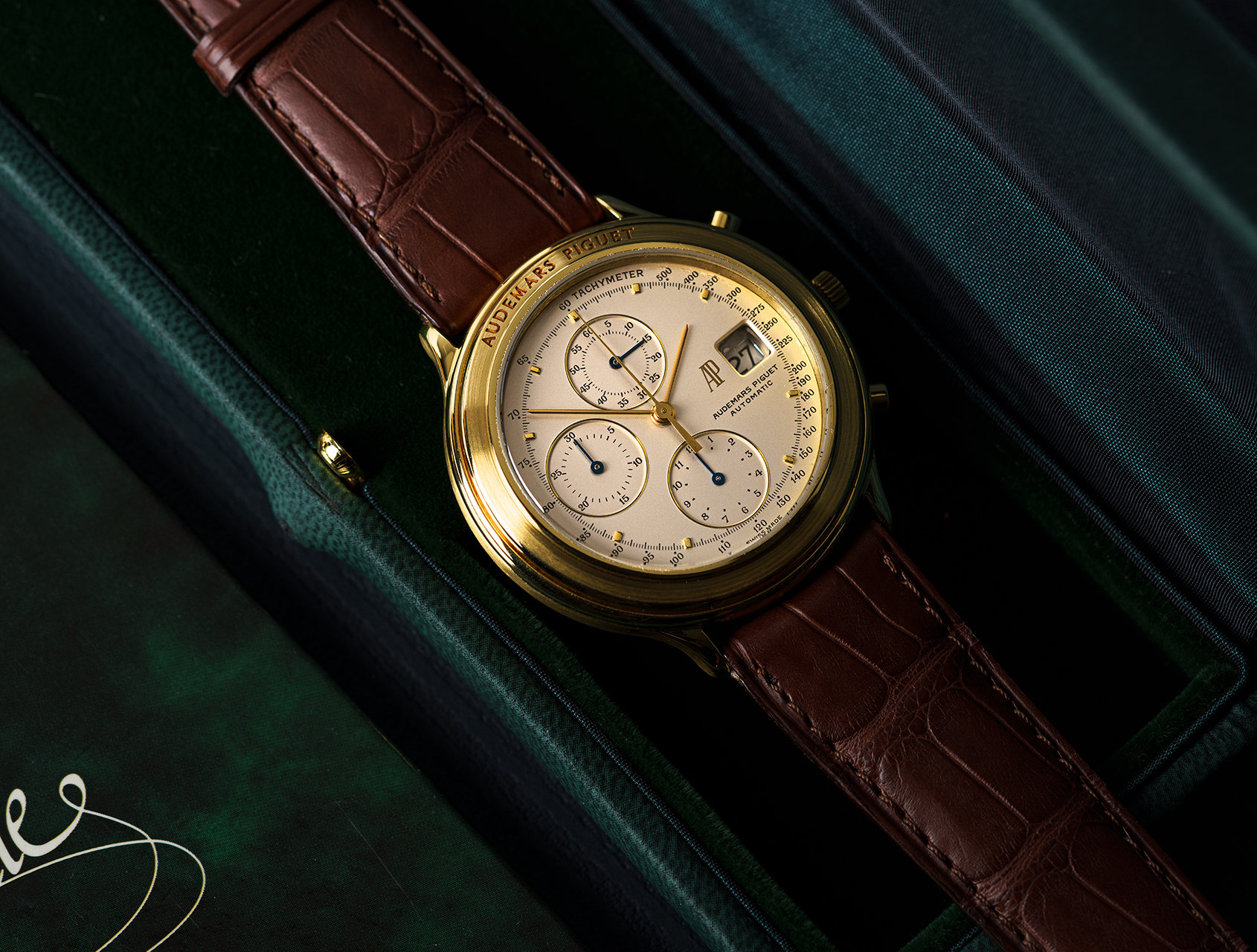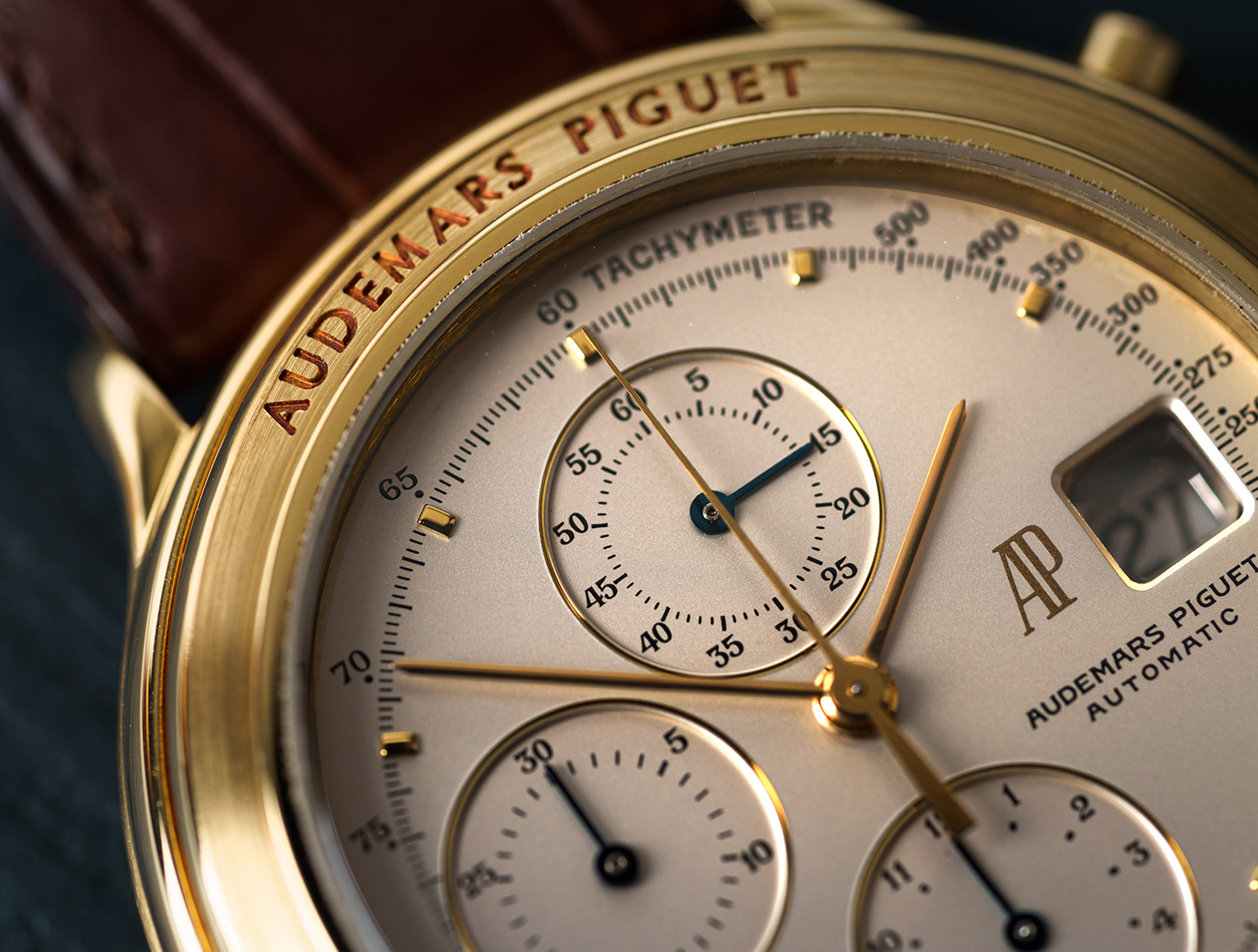 The inner tachymetric scale lends a nod to the gentleman racer while the simple lines of the solid 18ct yellow gold case make it equally wearable at dinner as on the track. The dial's typeface is clear whilst discreetly retaining the serifed font of Audemars' greatest traditional pieces. Applied gold hour markers, and date aperture at 3 with concealed magnifying lens. Powered by the beloved Jaeger LeCoultre-based AP automatic calibre 2126.