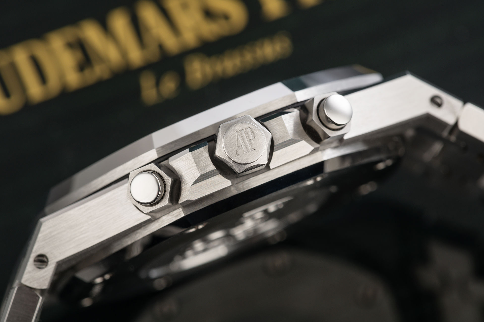 In exceptionally crisp condition, this latest 41mm Royal Oak chronograph is totally complete with its original Audemars Piguet box and certificate from January 2018. Sporting the new "20th Anniversary" black two-tone dial with signature "Grande Tapisserie" finish, this ref. 26331ST houses the automatic 2385 calibre chronograph movement with date and is waterproof to 50m.