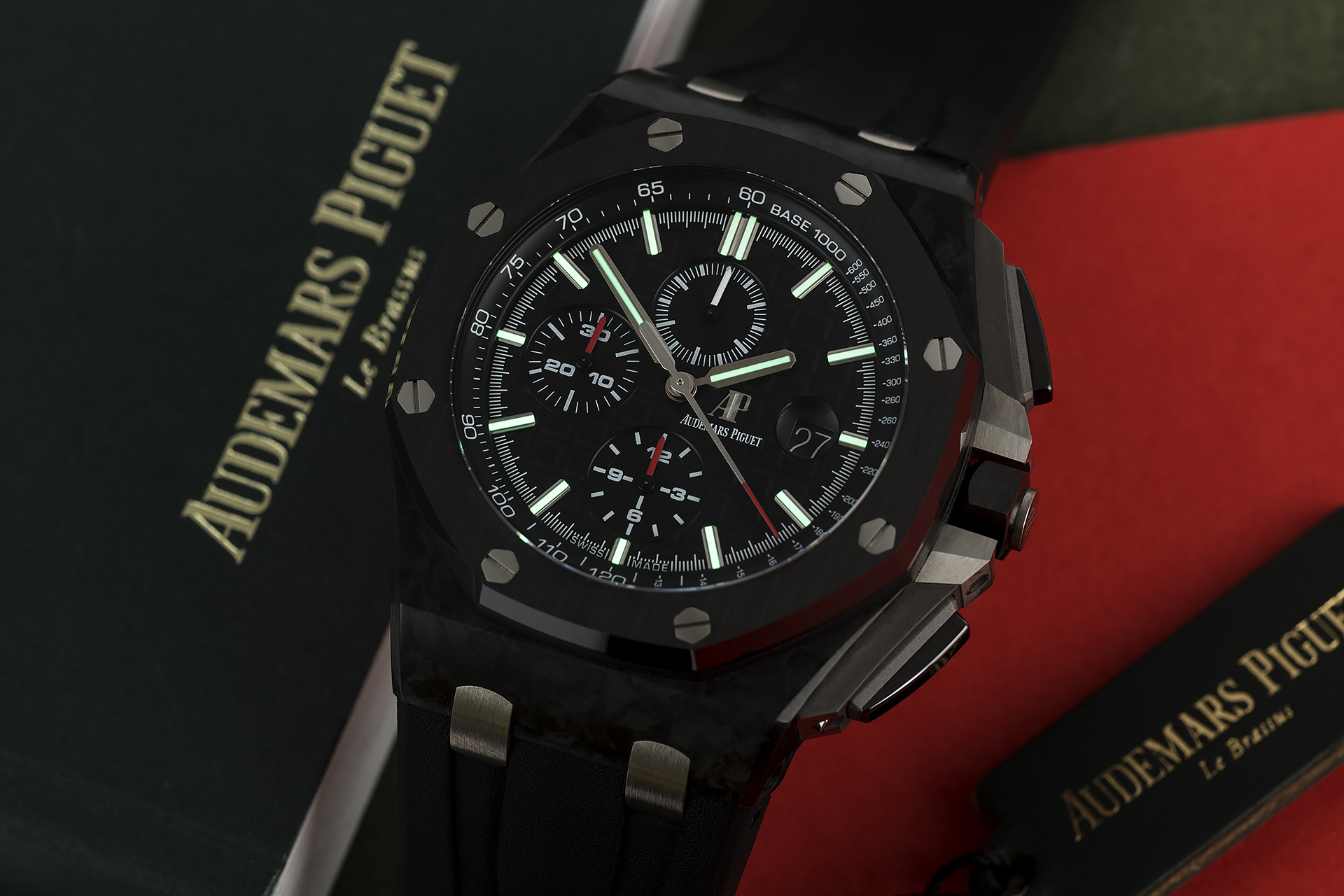 This 44mm Audemars Piguet Royal Oak Offshore looks superb. The black Mega Tapisserie dial, 44mm forged carbon case and black scratchproof ceramic bezel combine with the black rubber strap to deliver a truly stealthy Offshore. Powered by the in-house 3126/3840 automatic calibre with 50 hour power reserve and chronograph function this great diver's chronograph comes complete with its original Audemars Piguet box, guarantee and instruction booklet. Water-resistance is 100m.