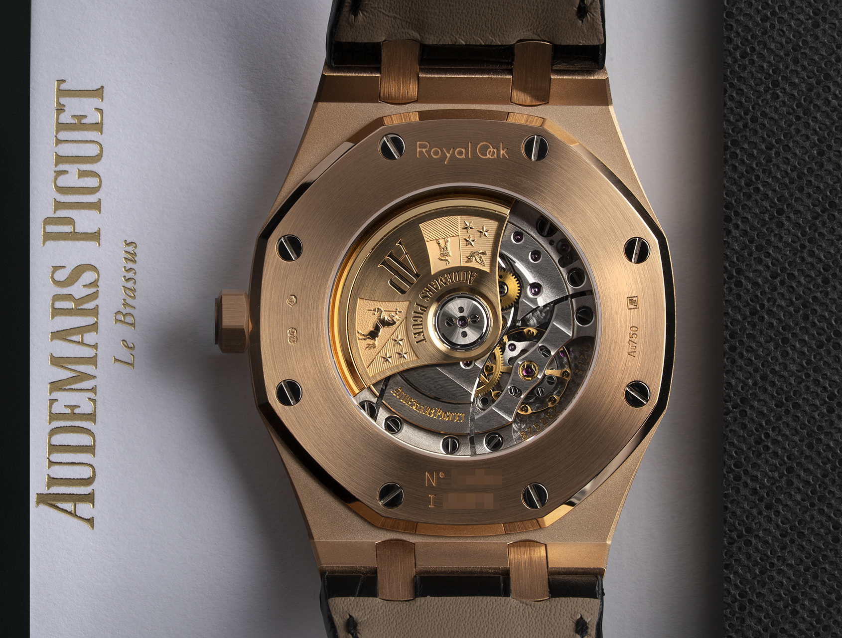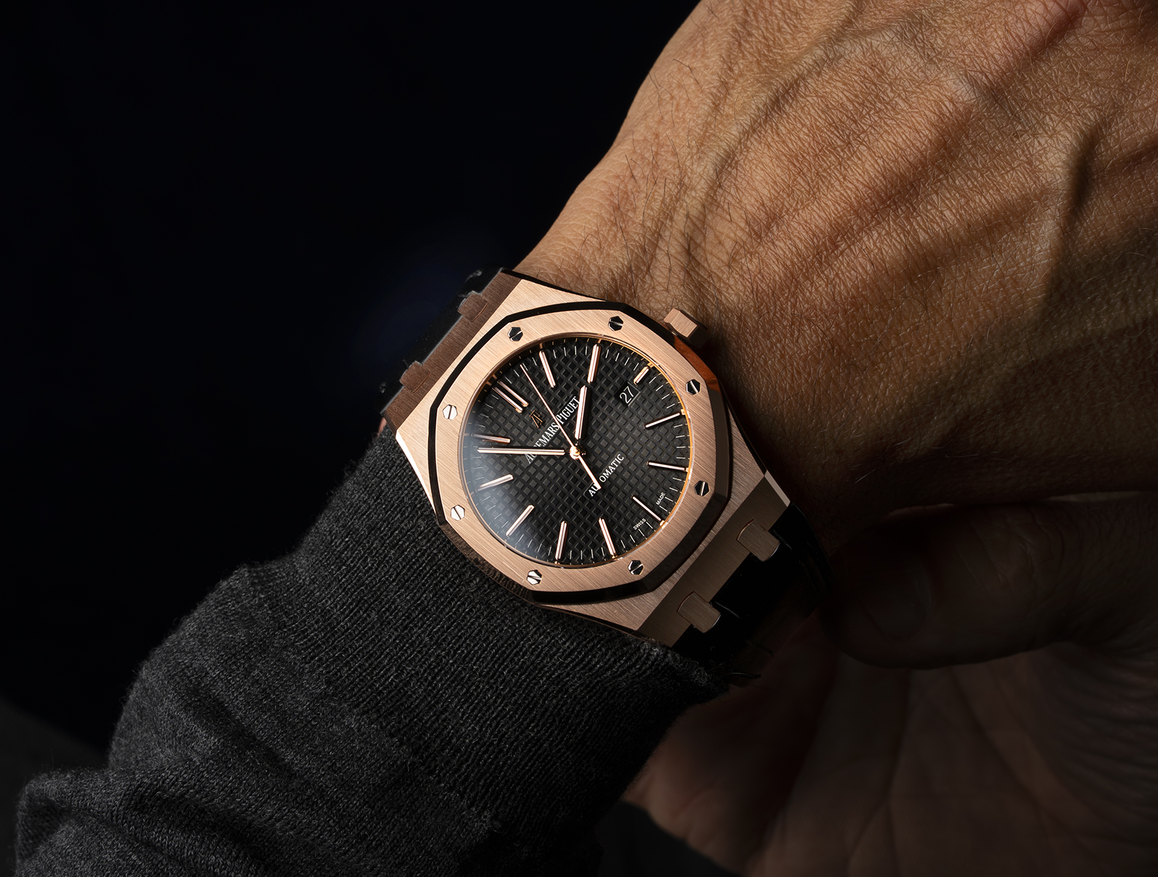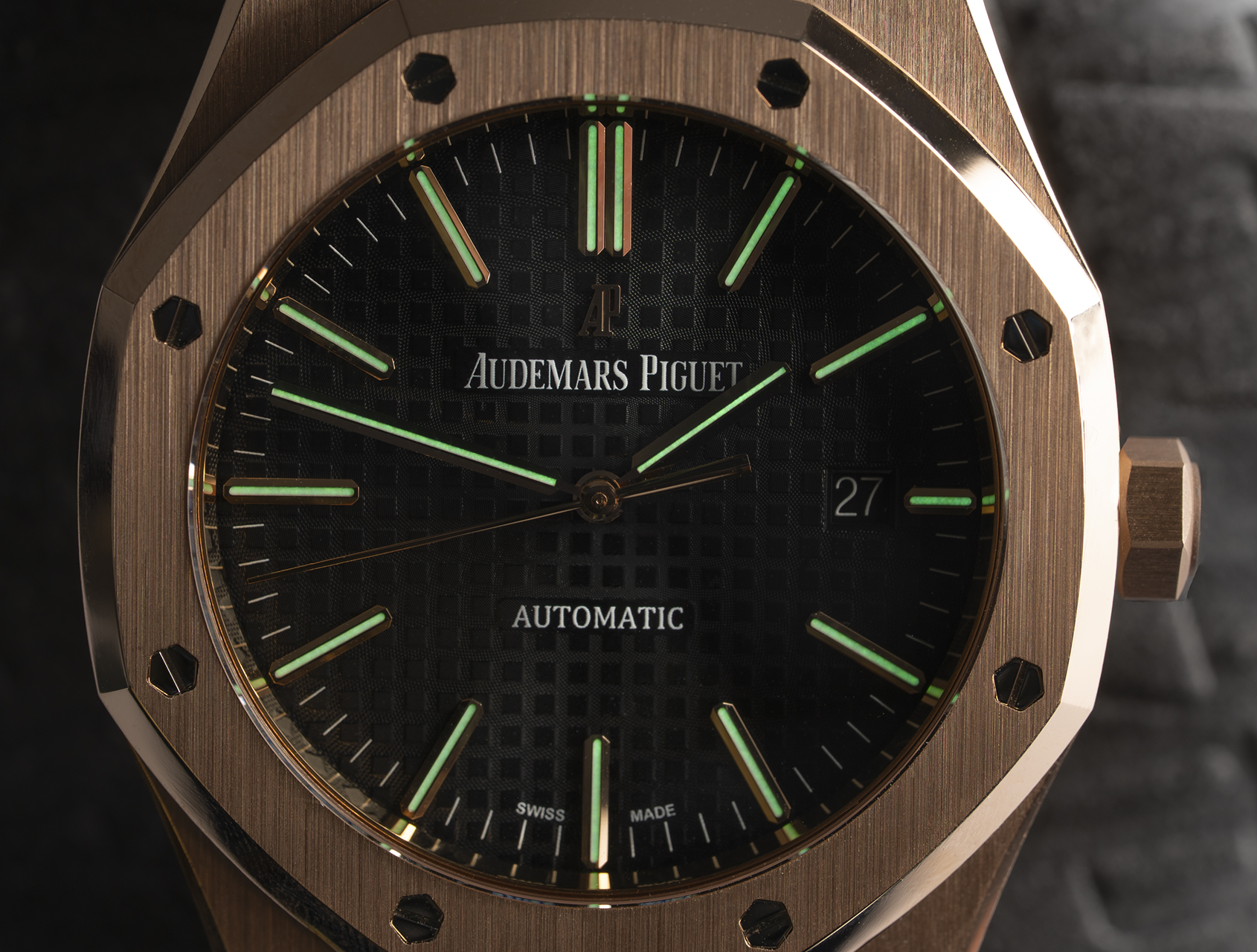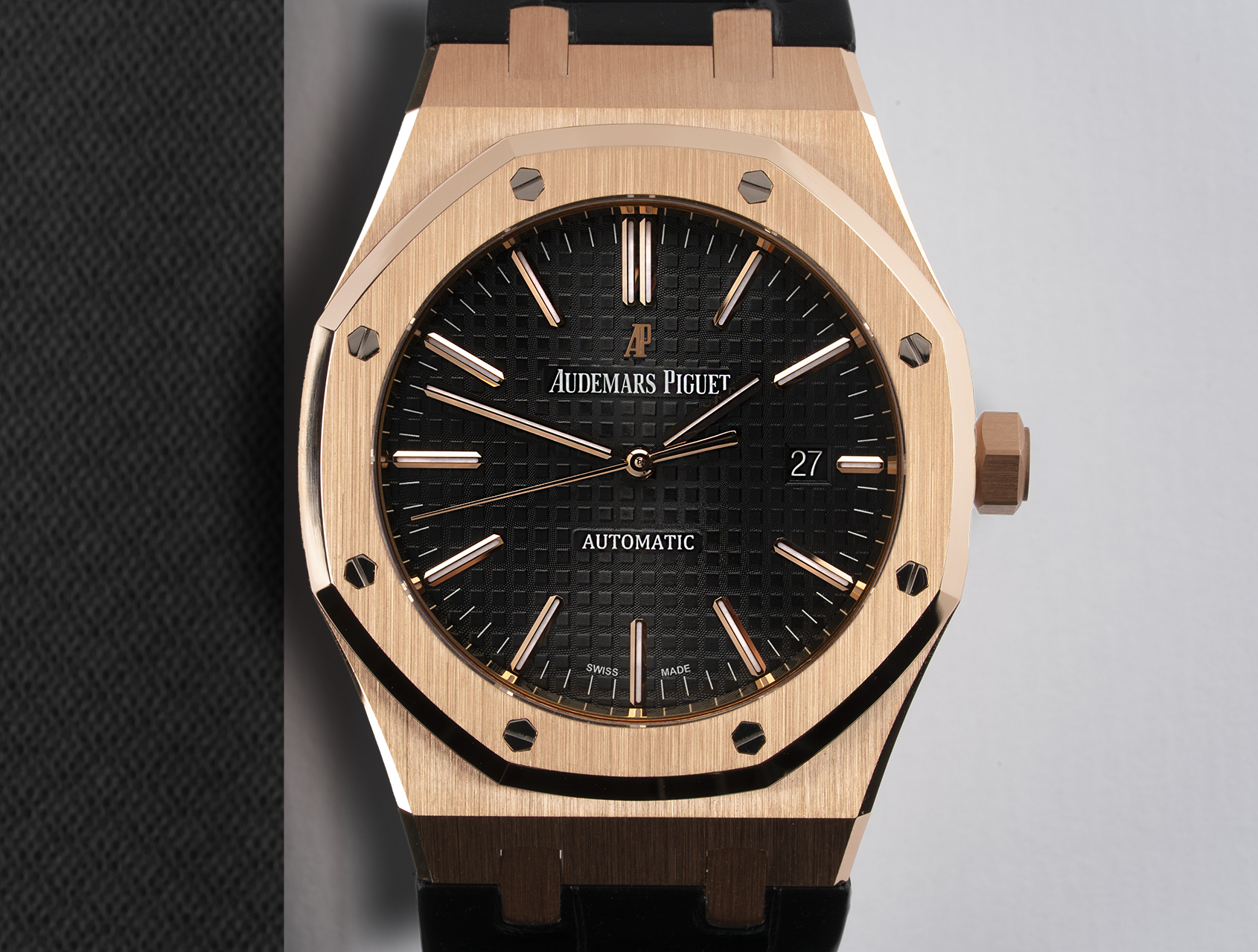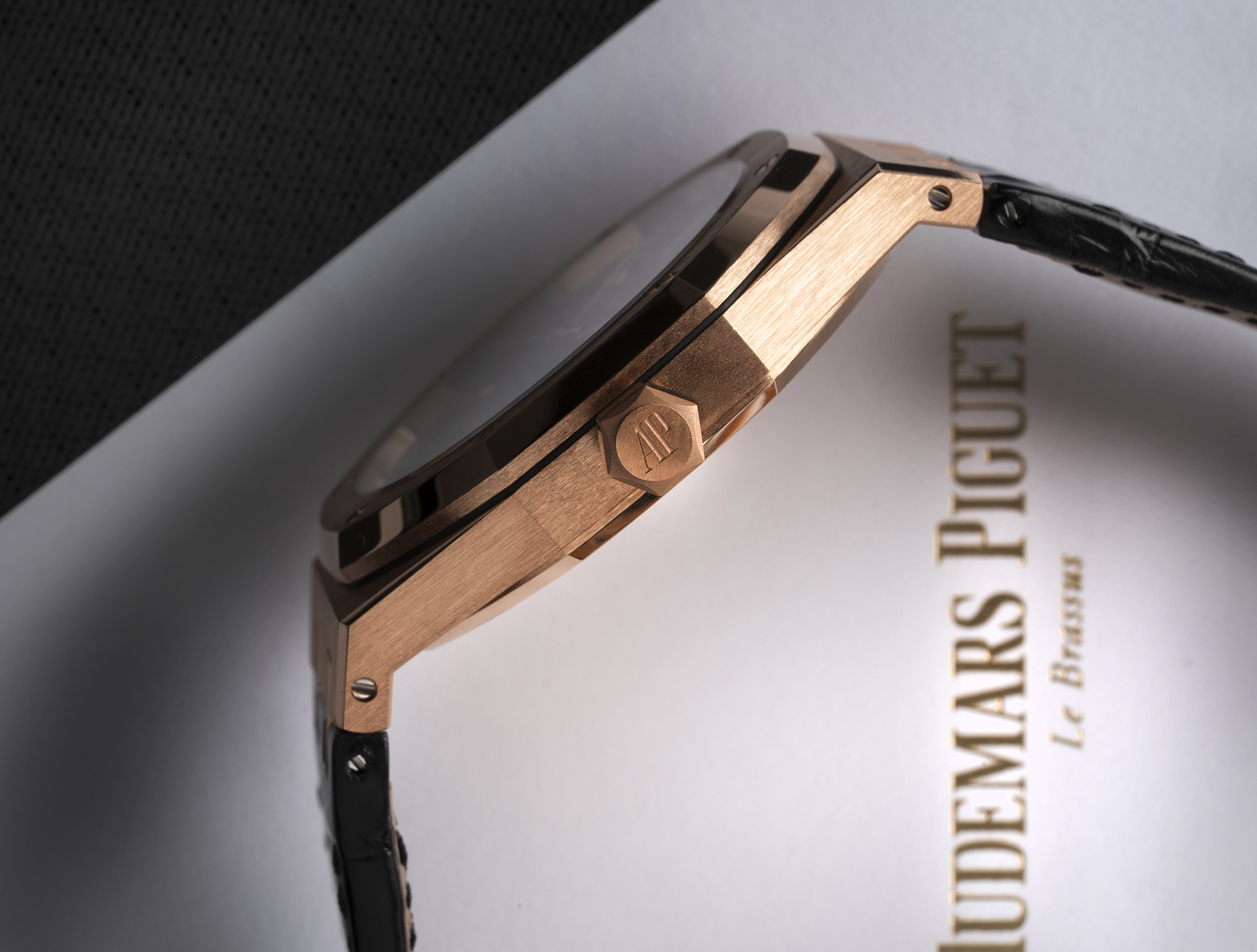 Released in 2012, this 41mm rose gold Royal Oak was introduced as a larger, more refined version to the series. It added a touch of elegance to the sporty Royal Oak design with its alligator strap, and matching rose gold AP folding clasp. The black dial is finished with AP's signature grand tapisserie, with luminous filled (rose gold) octagonal batons & hands, and a discreet date aperture at 3. In impeccable condition, Genta's octagonal case is razor sharp with perfect definition between the brushed & polished sections and chamfered edges. Through the exhibition caseback, you can view AP's self-winding calibre 3120. Waterproof guaranteed to 50m.