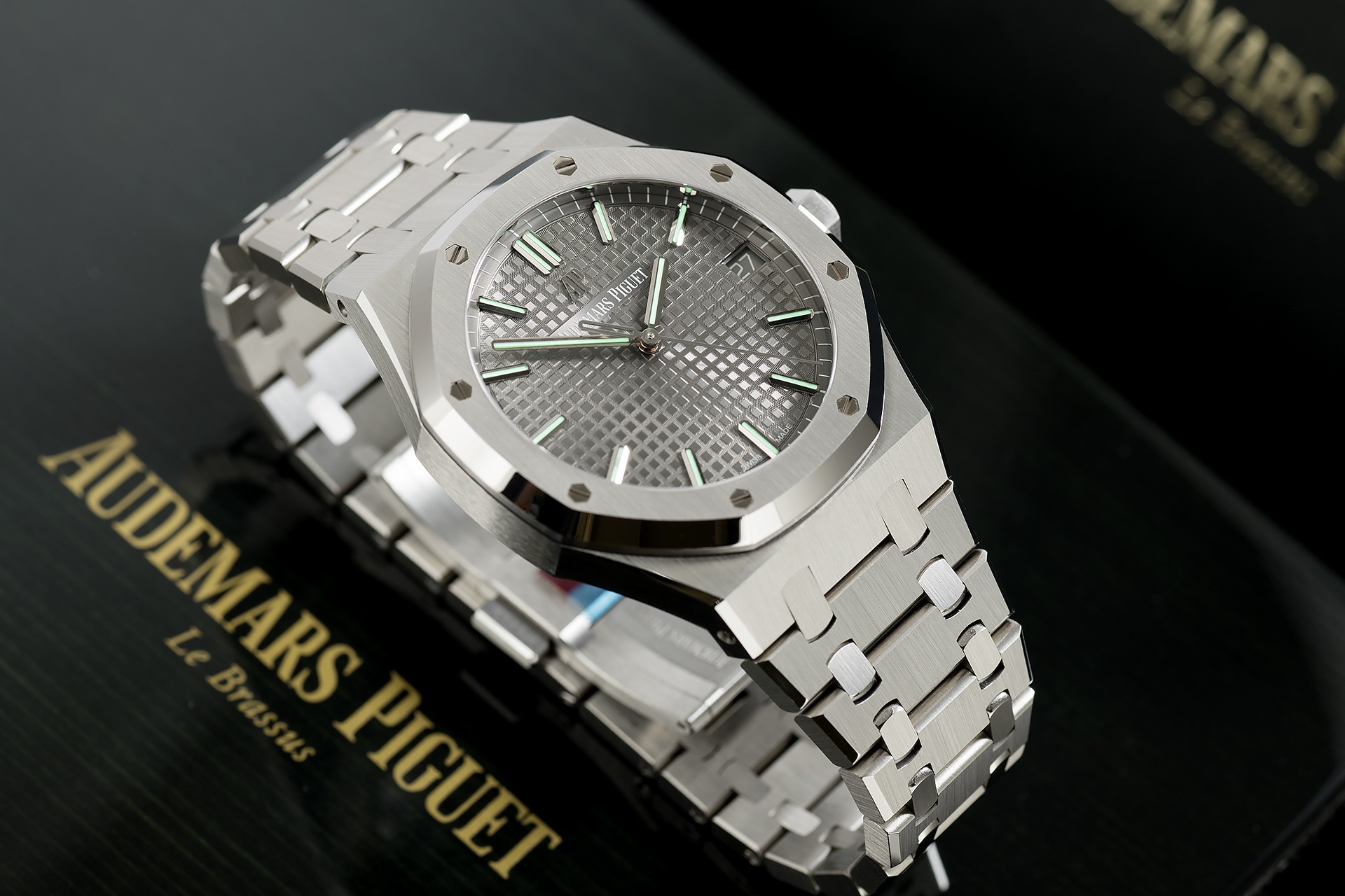 Our first brand new 41mm Royal Oak with the extremely rare slate grey 'Tapisserie' dial, and it looks absolutely stunning! With a minimum 12 month waiting list at official AD's, this example is completely brand new and under AP international warranty until 2022. Sporting the unique octagonal bezel and integrated bracelet (the best in the business!) with 'AP' logo folding clasp, it is powered by the latest automatic in-house calibre 4302 movement, offering a 70hr power reserve. Presented complete with its original wooden AP box, booklets, and Audemars international warranty card with the option of extending the warranty to 5 years. Water-resistant to 50m.