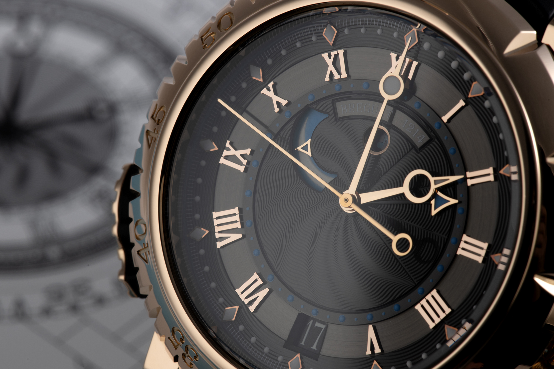 Current UK RRP is £40,200. This 45mm solid rose gold Breguet Marine Royale features a rotatable bezel & alarm function with power-reserve indicator. The musical note (' ♪ ') aperture at 12 displays the on/off function operated by the oversized button on the case side.