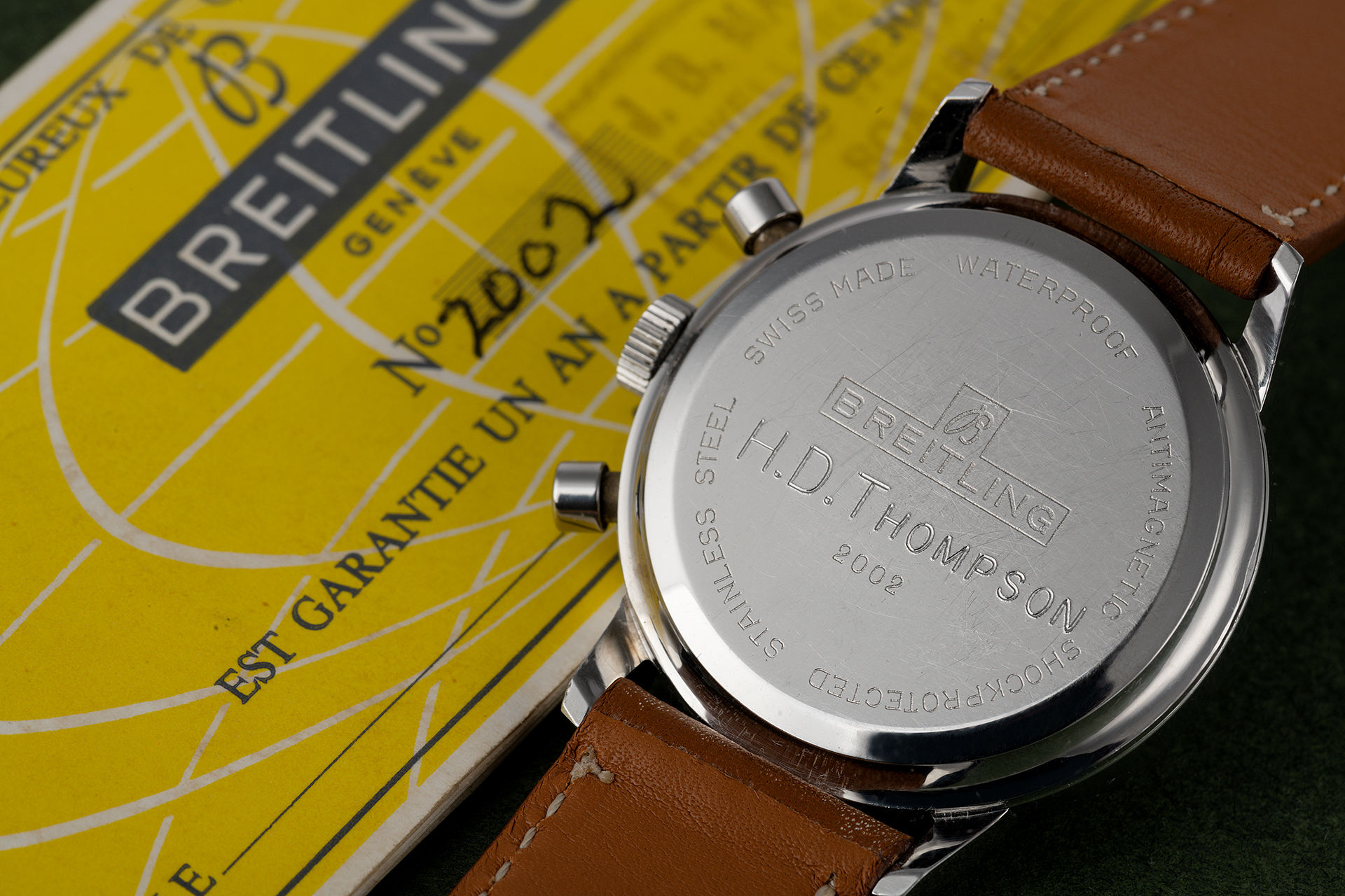 Sold just before Christmas 1966, the then-new owner Mr Thompson carefully preserved his treasured new Breitling Top Time with its original box and certificate (stamped by a jeweller near his home in Bridlington, Yorkshire). The dial, with its silver-printed 'B' Breitling logo and original tritium markings and hands has mellowed beautifully, as has the lightly-used one-piece ('monocoque') watch case. The movement is in similarly sharp condition, having enjoyed only a handful of services in its life. Vintage sports watches like this almost never appear anymore with original box and certificate, and the long-term value is always better with such provenance. This good-looking and decently-sized watch is fitted to a new strap, with vintage Breitling buckle, and is guaranteed by us for two years.