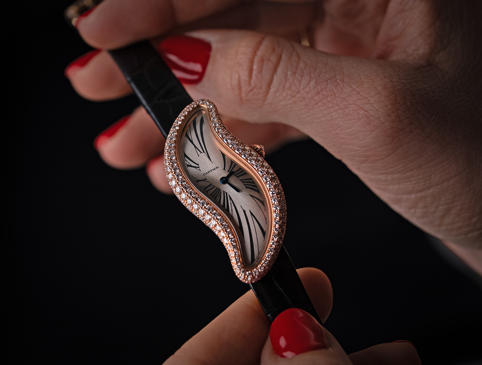 Featuring an elongated ‘S’ shaped 18-carat rose gold case (48mm x 22mm), a curved sapphire crystal, and a faceted diamond inset on the crown. Adorned by Cartier's master jewellers with round brilliant cut diamonds that wrap around the entire case, transforming a watch into a wearable work of art.
