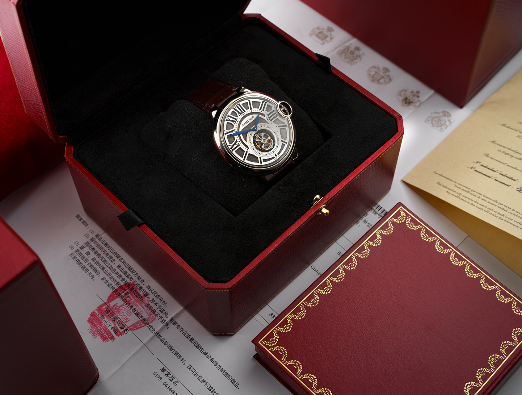 Its slate grey open-work skeleton dial, bold roman numerals and blued steel sword hands contrast beautifully against the backdrop of the 46mm white gold case. Visible through the case back is Cartier's in-house hand-wound calibre 9452 MC, with its unique "CC" tourbillon carriage and engraved case number. Fitted to a brown Cartier alligator strap, secured by its white gold folding clasp.