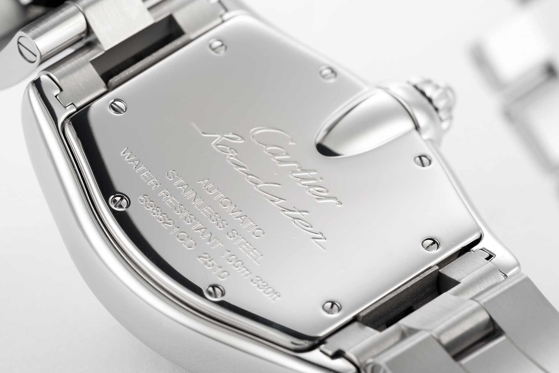 In fantastic condition, this gent's size automatic stainless steel Cartier 'Roadster' features the black 'racing dial' with luminous hour indicators. This automatic sports watch (water resistant to 100m) is complete with its original red Cartier box, warranty certificate, brand new spare alligator strap and steel deployant clasp. 2 year Watch Club warranty.