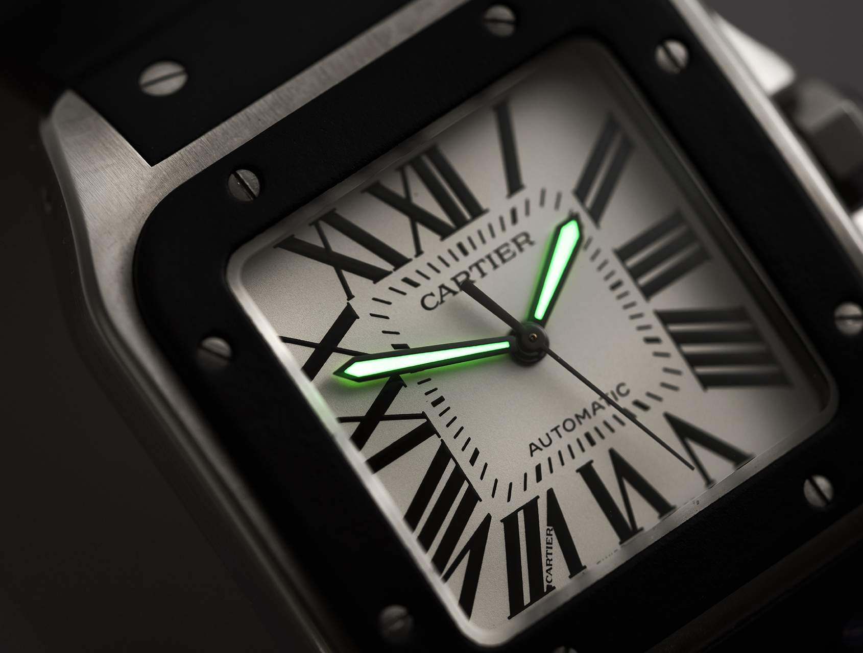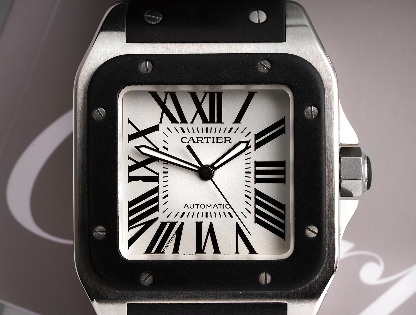The substantial 41.3mm stainless steel case is framed by a black rubber bezel, secured with Cartier’s signature exposed screws. The silver dial with bold Roman numerals, a railroad minute track, and sword-shaped hands are all hallmarks of the Santos lineage.