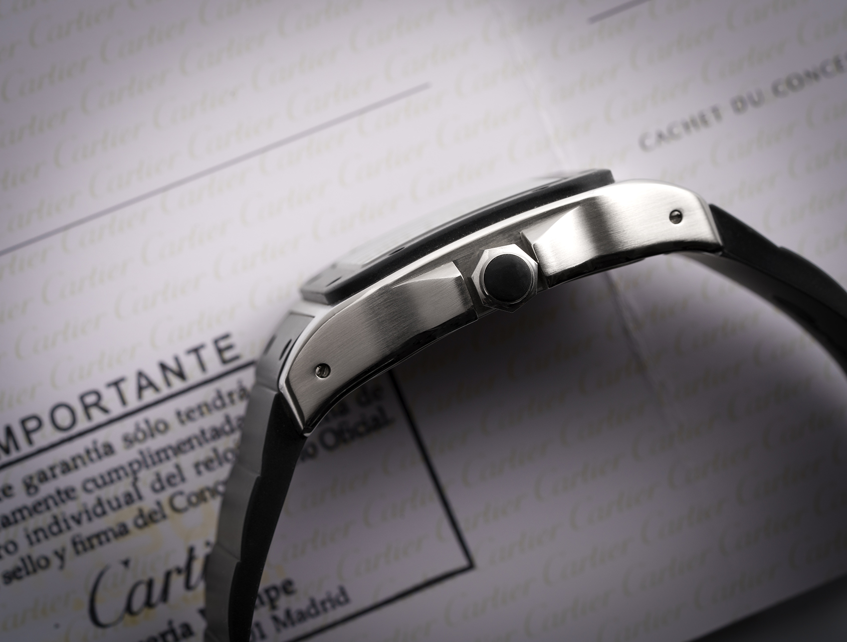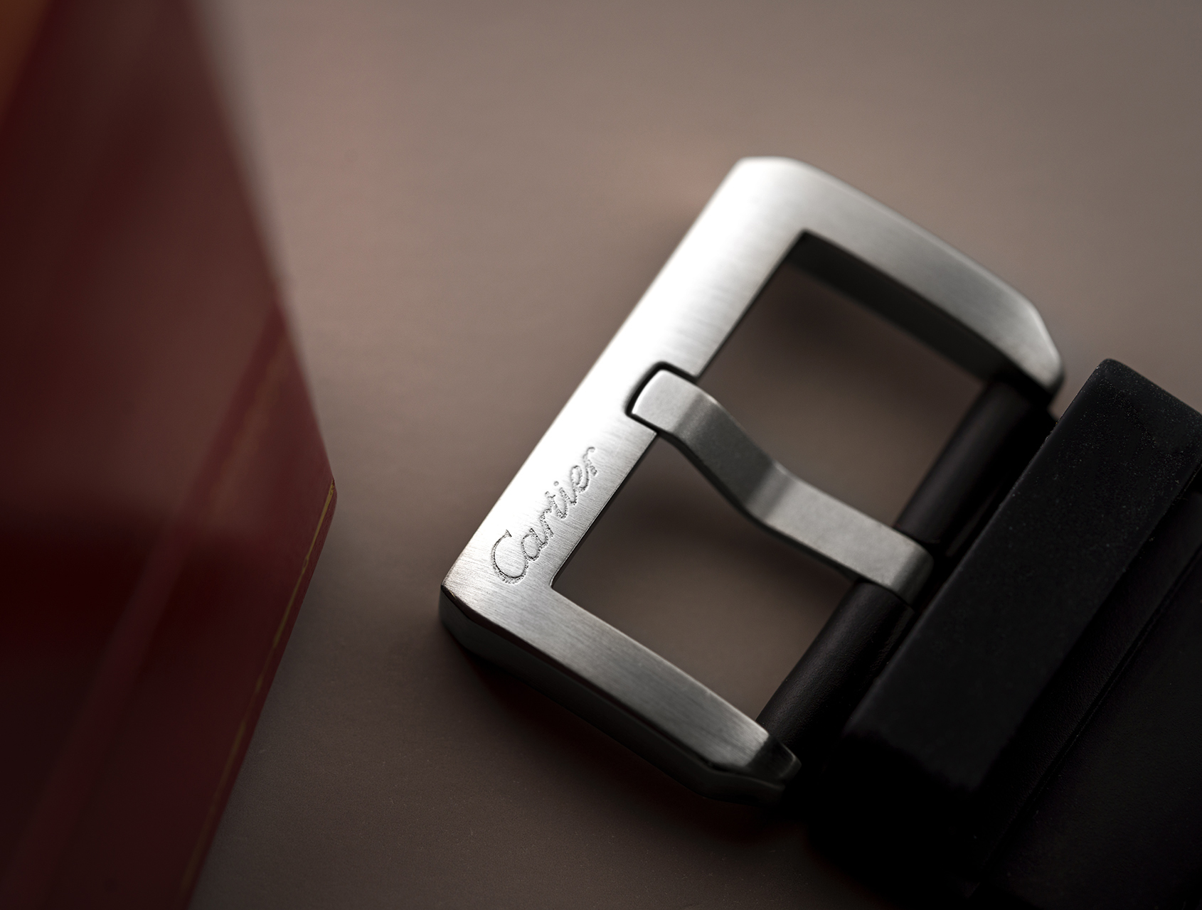 Powered by the Cartier self-winding Calibre 049, 100 metres water resistance, and fitted to its Cartier rubber strap with a brushed steel Cartier pin buckle.