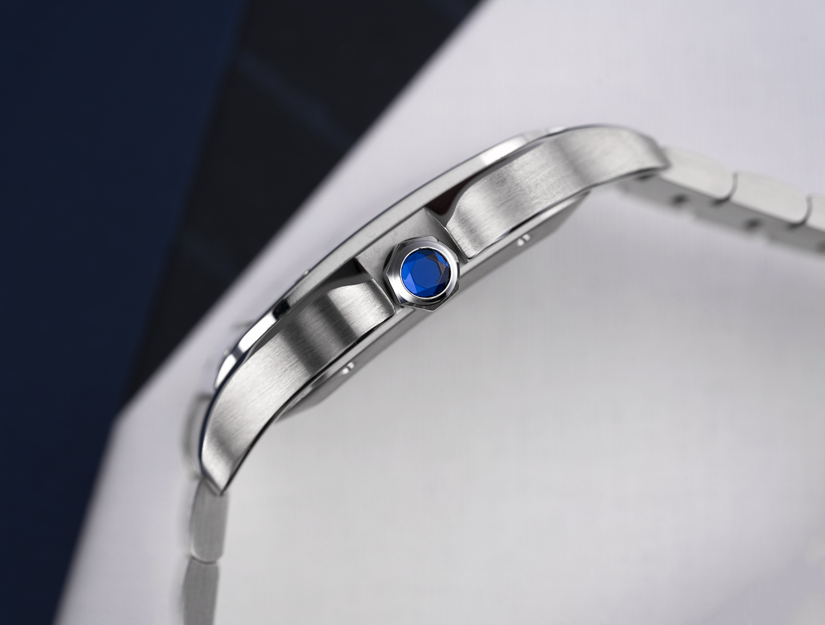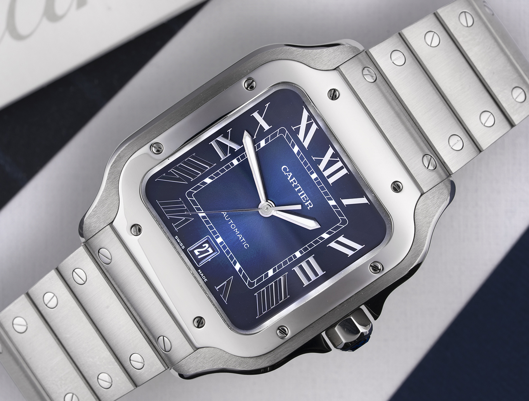 This large 40mm stainless steel Cartier Santos with gorgeous graduated blue dial, really is exceptional value. The "QuickSwitch" interchangeable bracelet with "SmartLink" adjustment offers superb versatility.