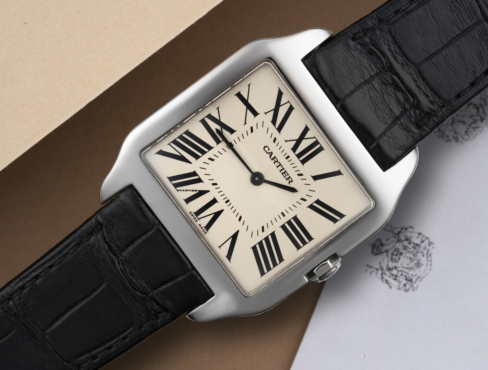 At 35mm x 44.3mm, our large 18ct white gold example is instantly recognisable by its elegant slim square case with gently tapered smooth edges, elegant opaline dial with Roman Numerals, discreet signature at 7, and of course, Cartier's famous blue winding crown.