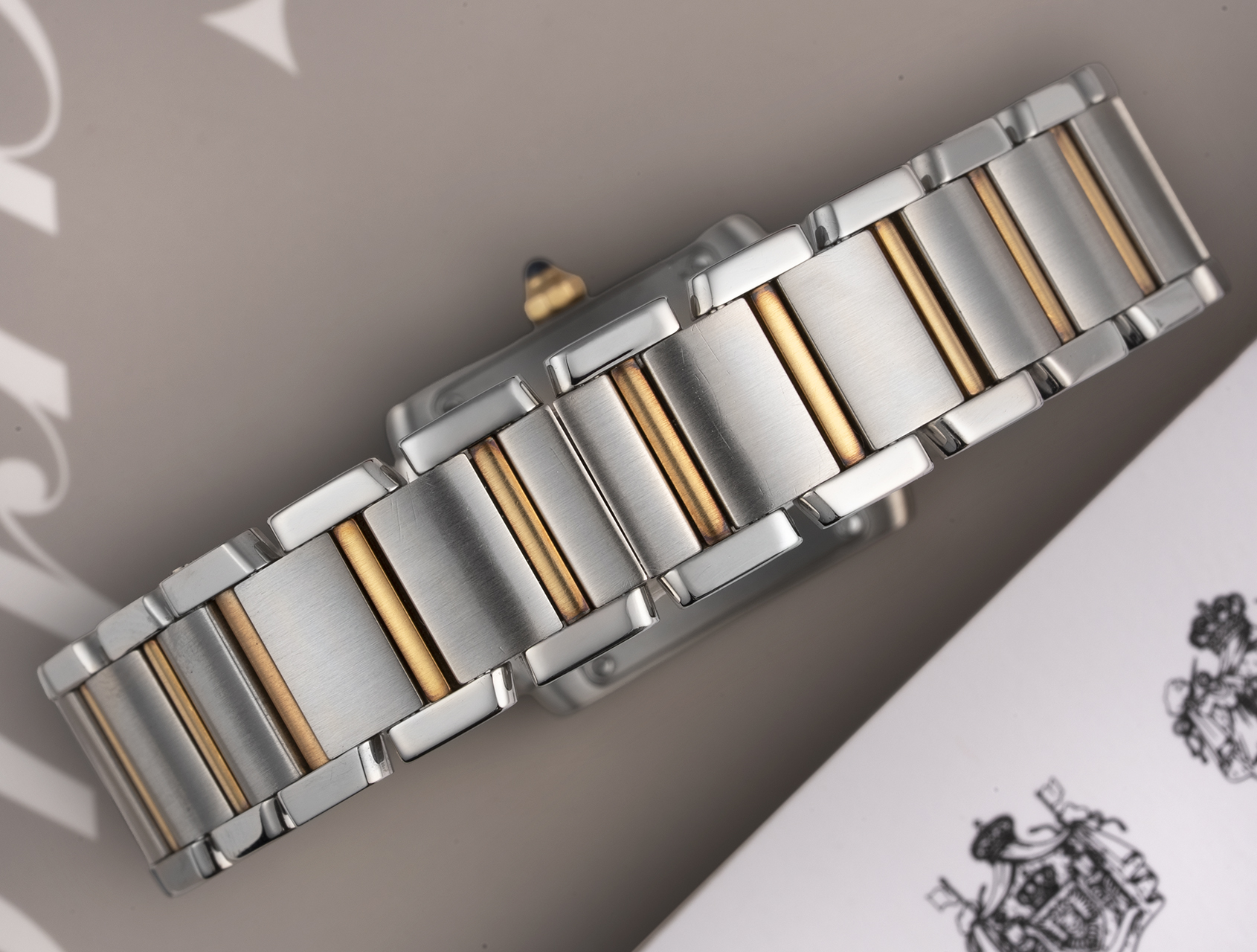 Our 21mm 18ct yellow gold and stainless steel Tank was retailed in April 2001. It features an Opaline roman numeral dial, yellow gold Cabochon crown, blued-steel hands, and is fitted to the iconic Tank bracelet. Powered by the Cartier quartz movement and waterproof to 25m.