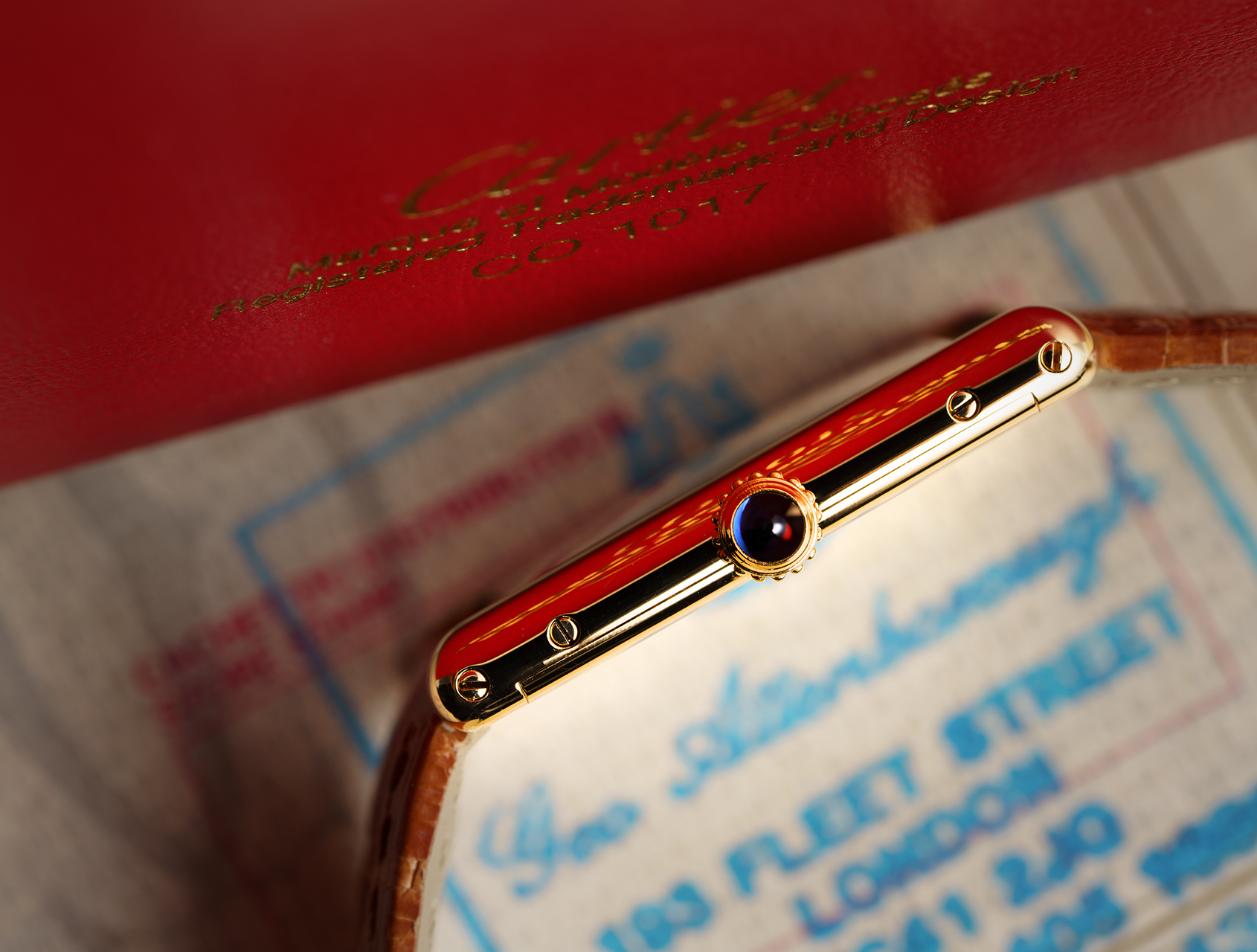 This rare Mecanique Louis Tank was retailed on Fleet St in 1993, made in 18ct yellow gold, paired with a beautifully clean ivory guilloché dial and is in immaculate condition. While many Tanks from this era transitioned to quartz, this watch is powered by a manual-winding mechanical movement, wound by its sapphire-set crown. Fitted to a tan Cartier alligator strap and fastened by its Cartier pin buckle.