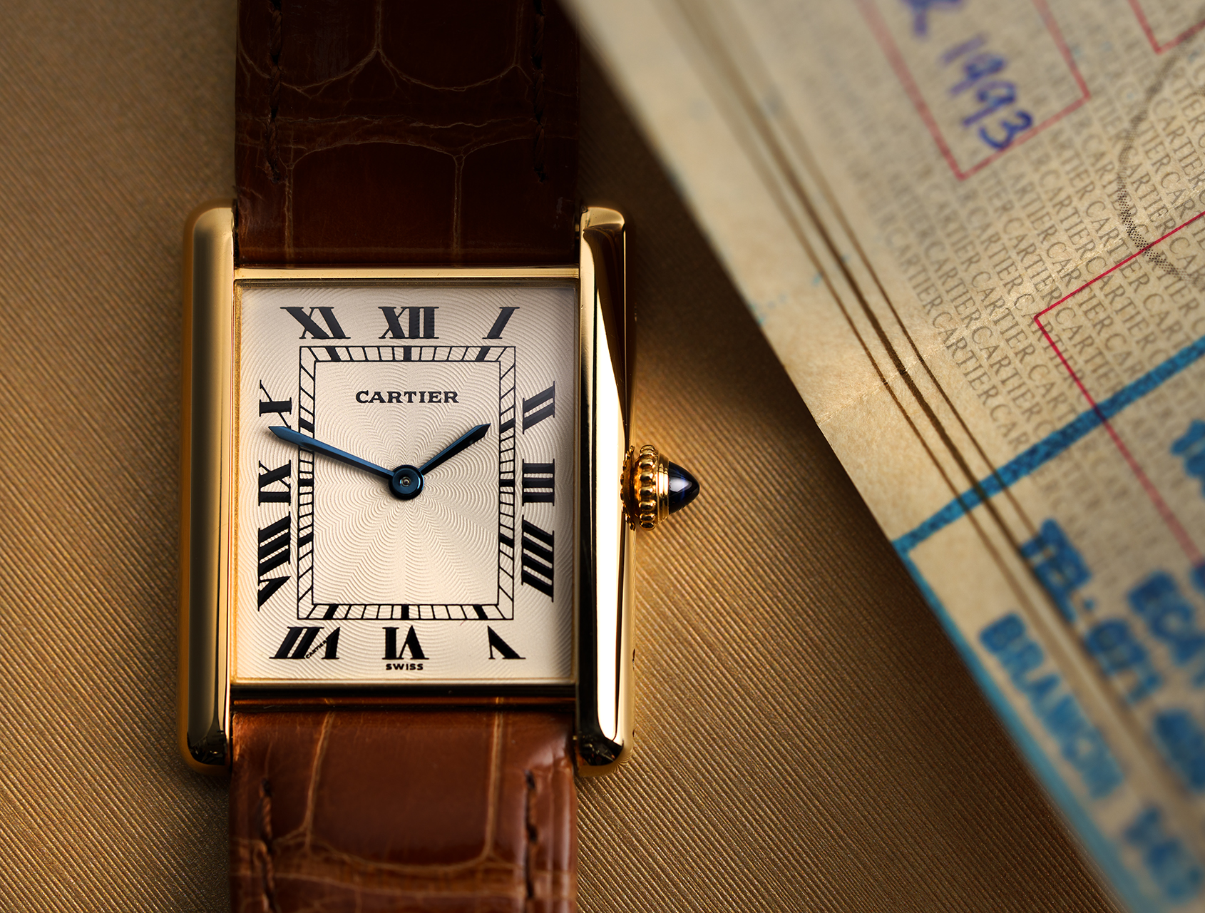 Timeless, discreet, and effortlessly refined, this yellow gold Tank comes complete with its Cartier Certificate from October 1993 and its vintage Cartier box. Under guarantee for 2-years.