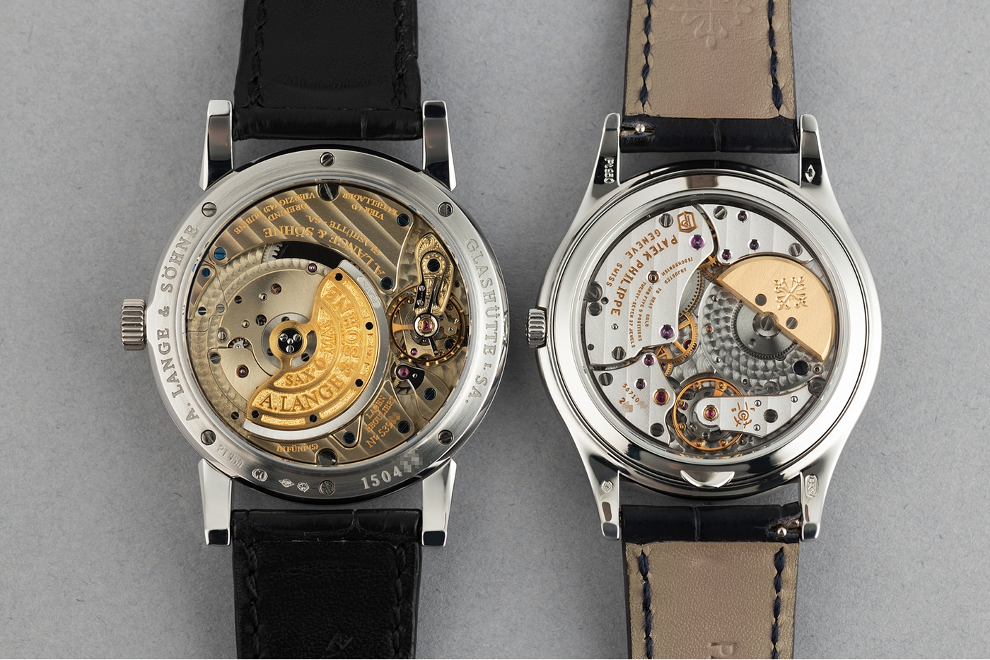 With two horological heavyweights like these, there are a lot of fireworks and fun to be had around the back too. Both have incredibly beautiful movements with all the perfect chamfers, stripes and perlage you’d expect. Looking closer though, we see the same fundamental differences in the movements that we identified in the case and dial designs.