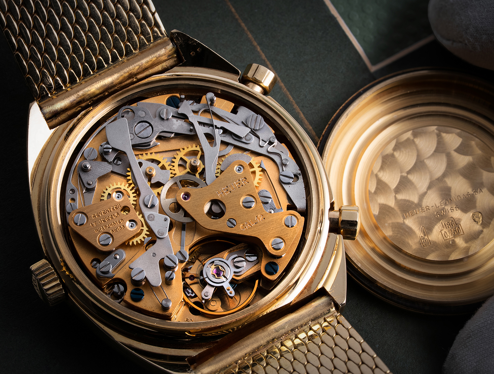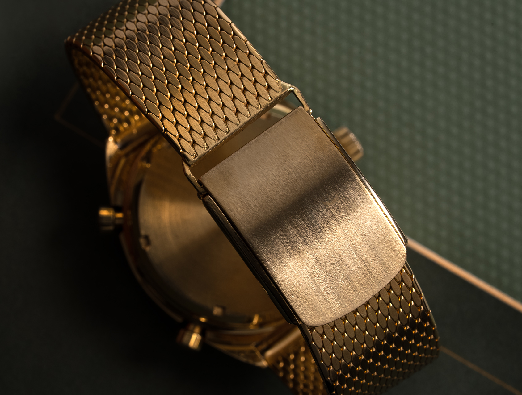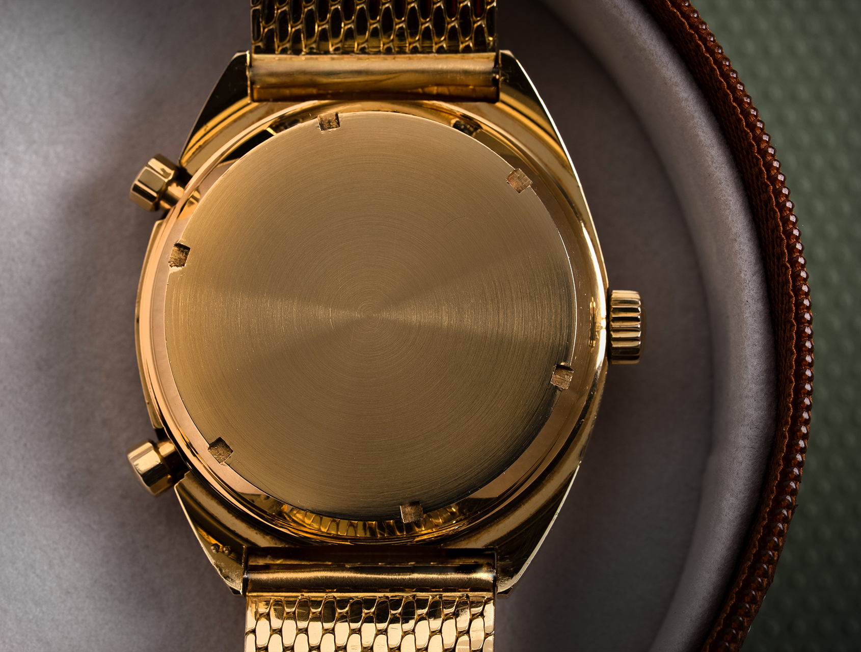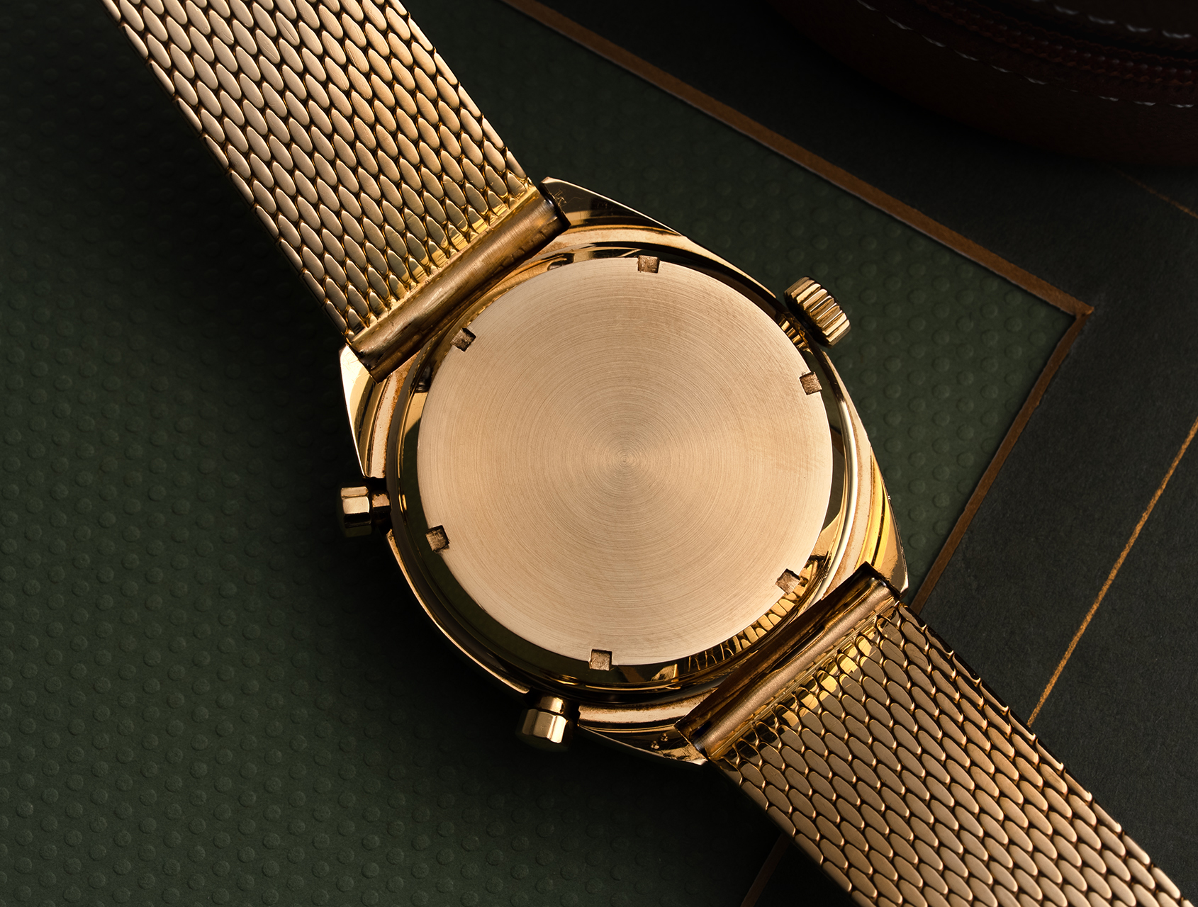 The 38mm yellow gold case is paired with its original heavy Milanese gold bracelet. It houses the innovative Calibre 12 automatic chronograph movement; a key chapter in chronograph history as one of the world’s first automatic chronograph movements, jointly developed in 1969. Opening the solid caseback reveals sharp Geneva stripes and Heuer-Leonidas engravings.