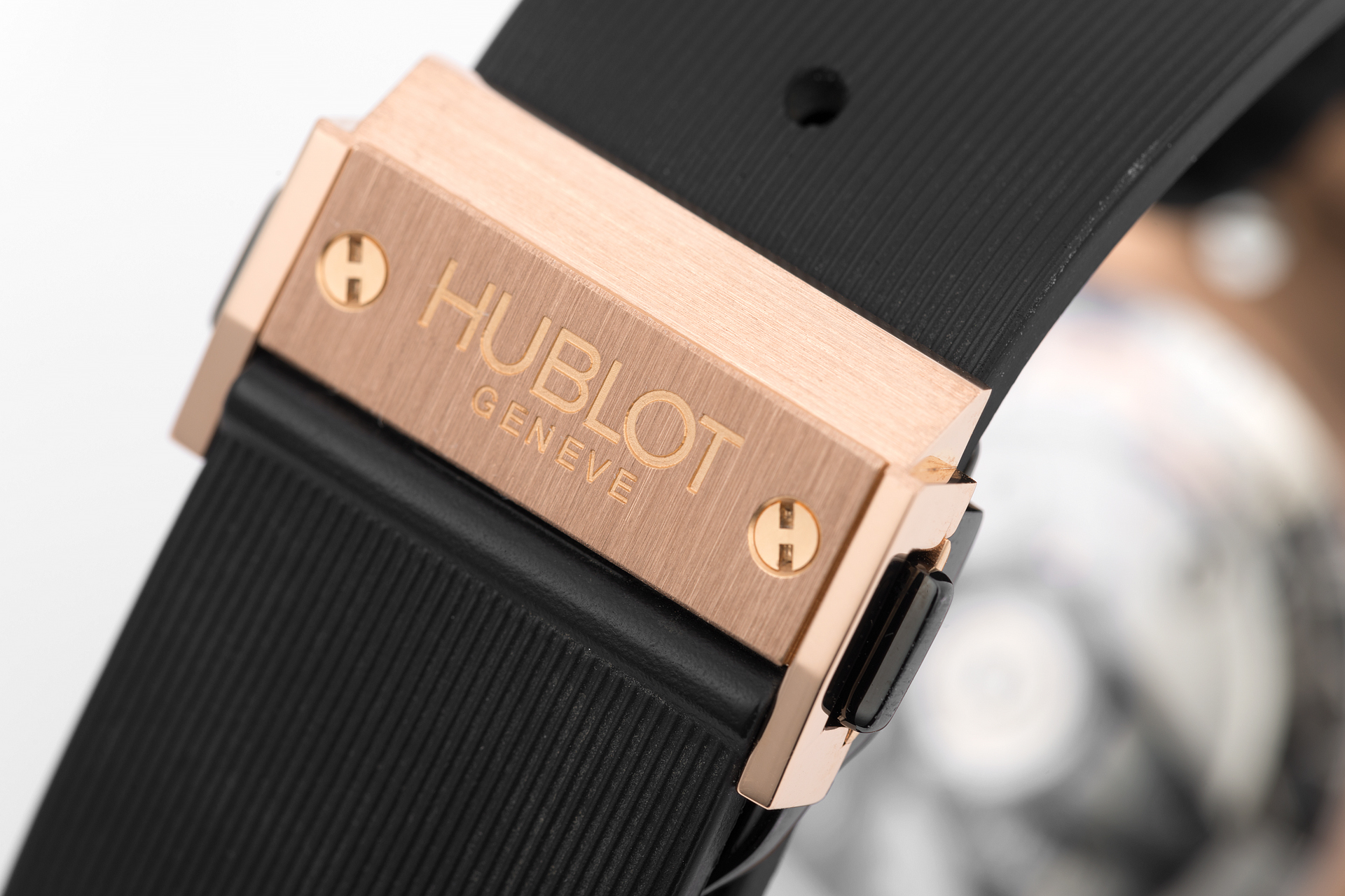 We treated this 18ct rose gold Big Bang to a full service with Hublot and they have returned it to us in beautiful condition. The 44mm case is topped with a rugged scratch-proof ceramic bezel, and houses a titanium core that protects the automatic chronograph movement. Fitted to the signature water proof Rubber strap with rose gold folding clasp and presented with its wisekey warranty card and a cool Hublot travel pouch (and padded box).