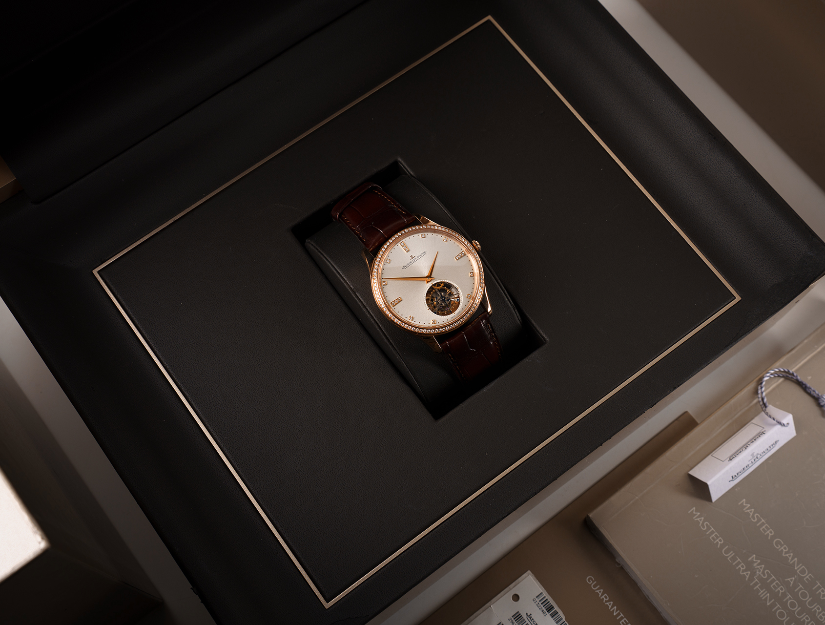 An elegant gentleman's dress watch with a 40mm Ultra Thin case, silver diamond-set dial, dauphine hands and the incredible tourbillon escapement positioned at 6. Sitting seamlessly under a shirt cuff at only 10mm thick, fitted to its brown JLC alligator strap and fastened by a solid pink gold double folding clasp. Visible from its sapphire crystal case back is the self-winding Jaeger-LeCoultre Caliber 982 with pink gold rotor, with a power reserve of 45hrs. Water resistant to 50m.