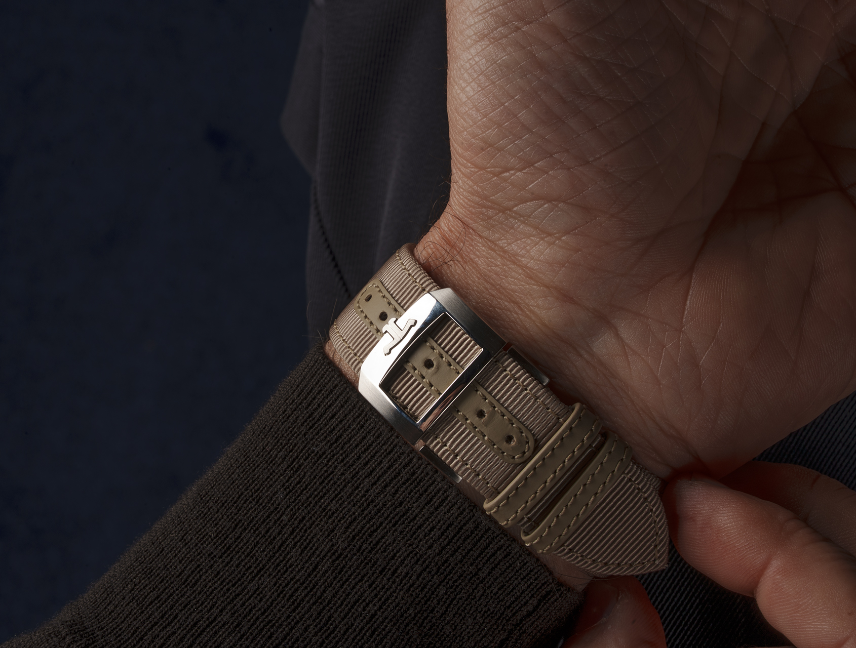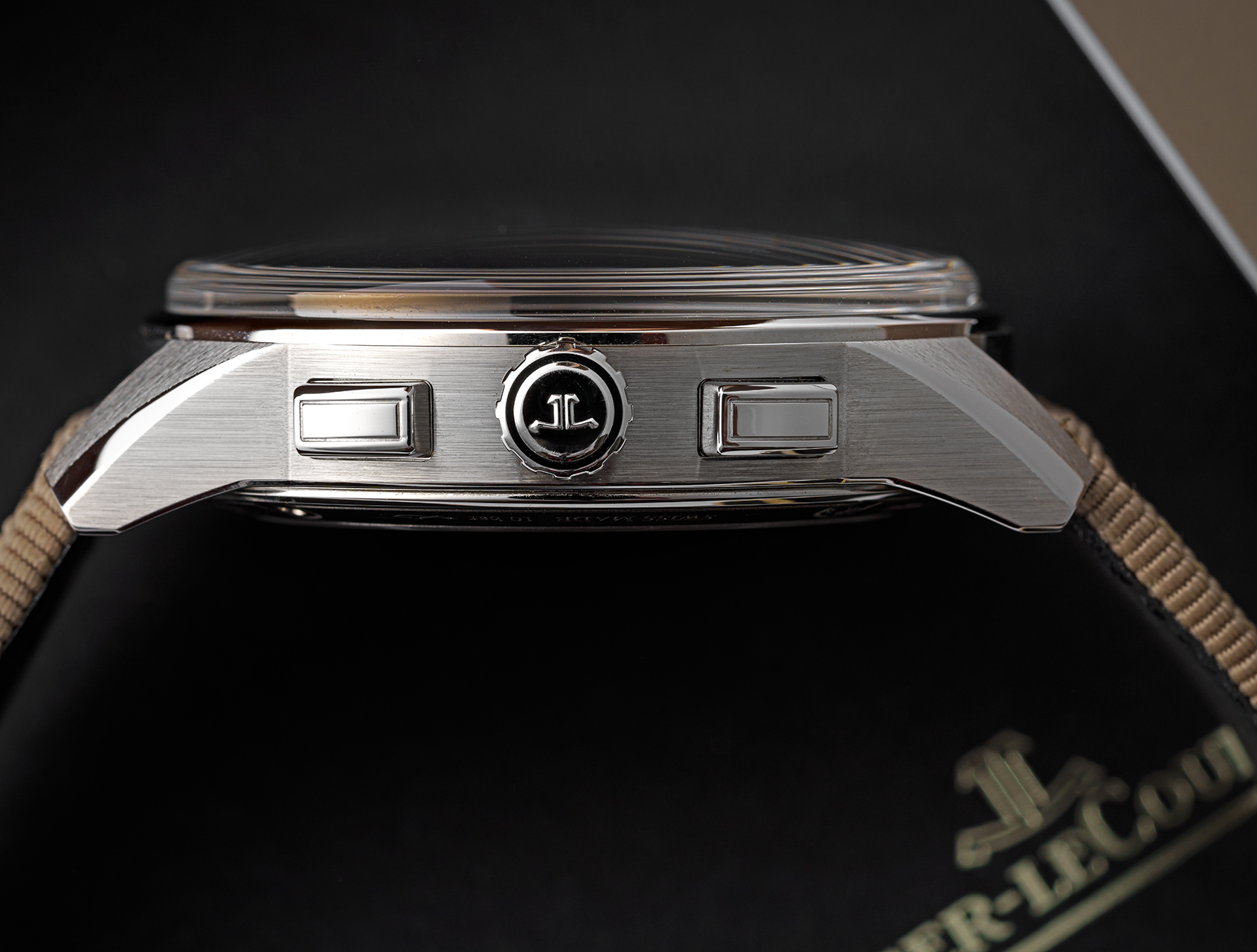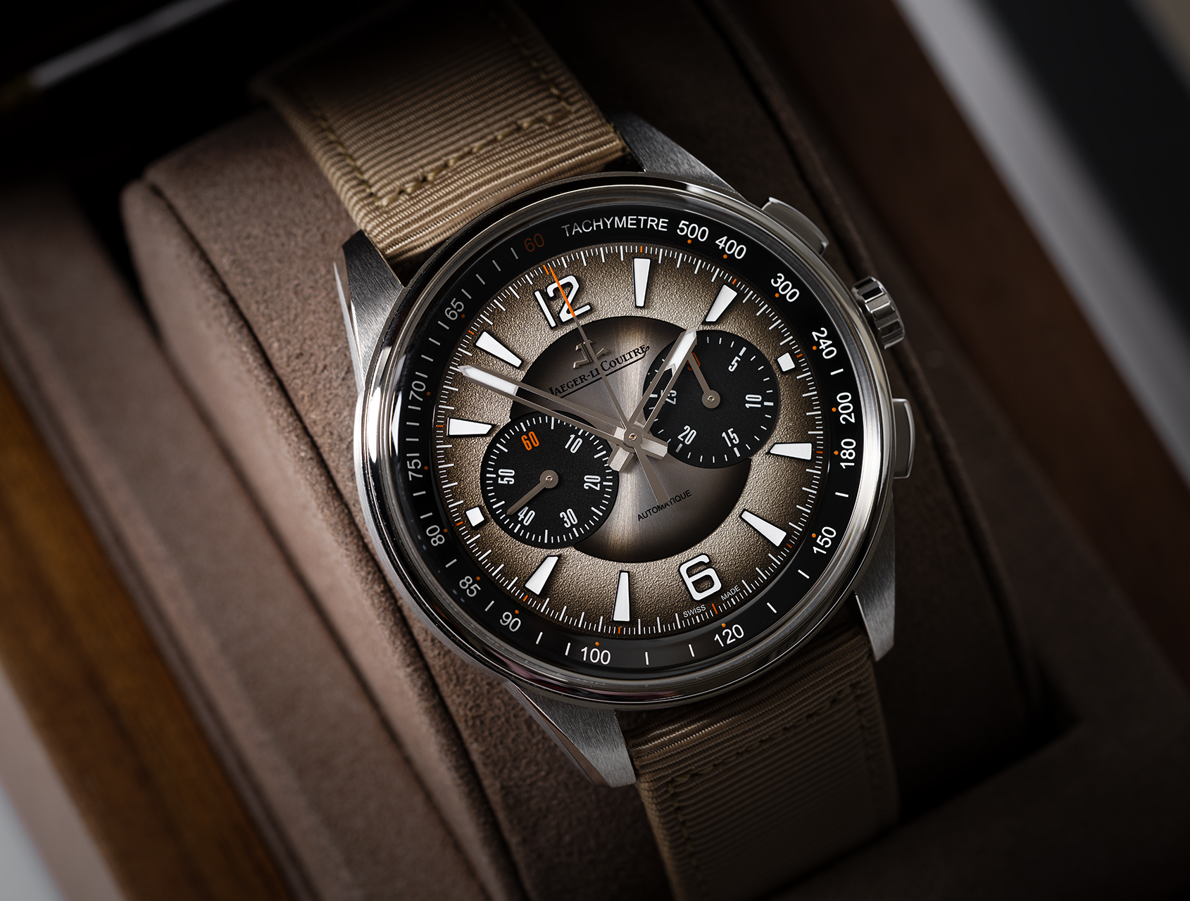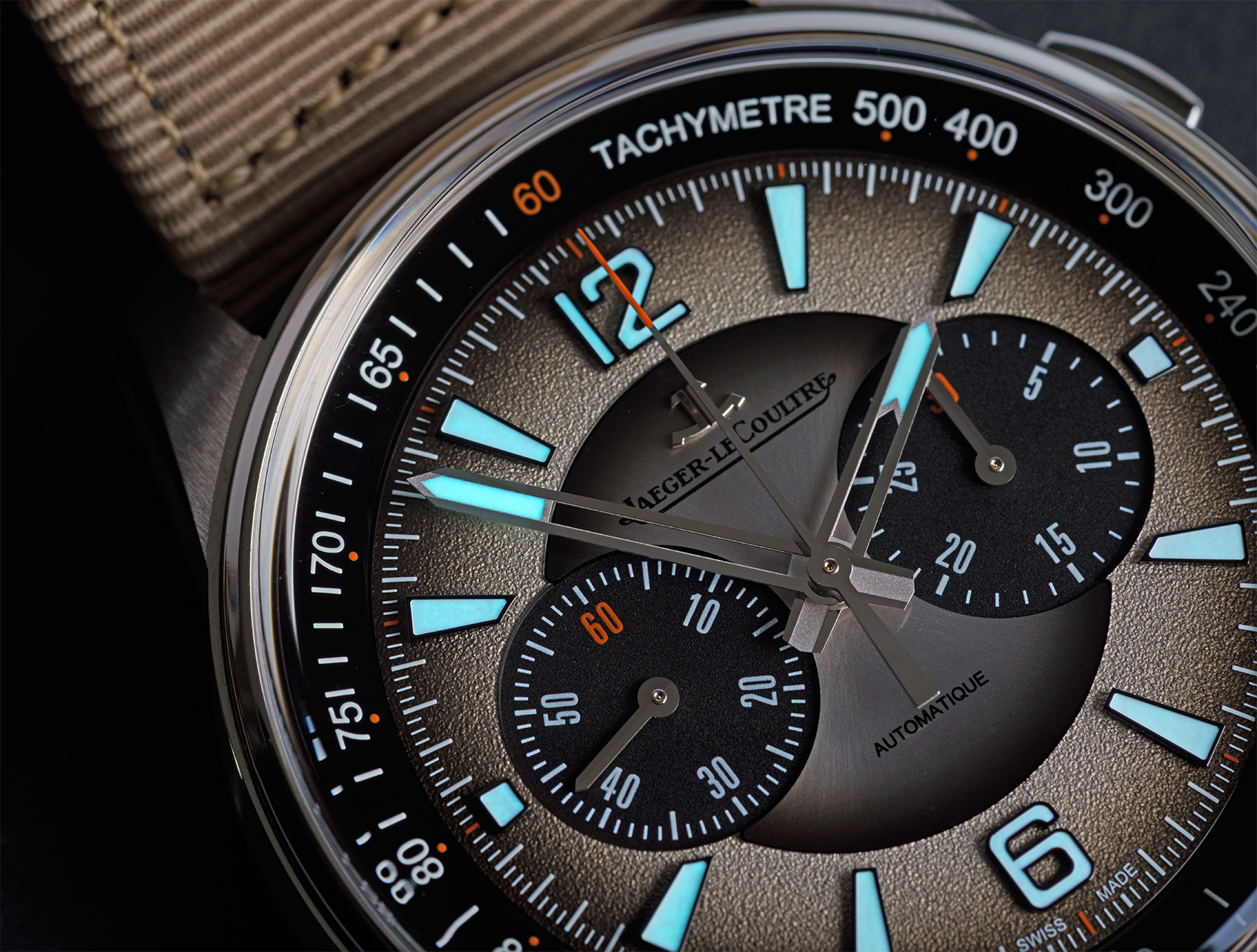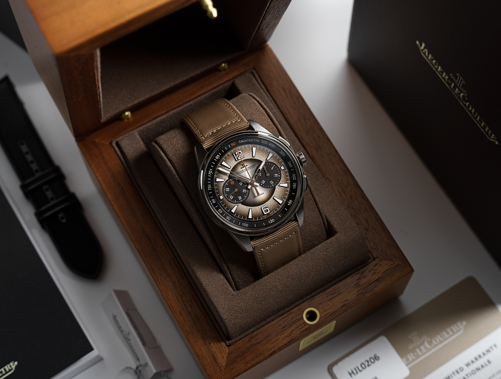 The dial features three levels of meticulous finishing: an internal glossy black tachymetric bezel, a grained chapter ring for the hours & large luminous indexes, as well as a sunray-brushed graduated centre, punctuated by its Chronograph registers. The quick-release interchangeable strap system allows effortless changes in style, switching from the taupe canvas strap to the additional black rubber option with ease. Powered by JLC's masterful self-winding calibre 761 with column wheel & vertical clutch, 65-hour power reserve, and waterproof to 100m.