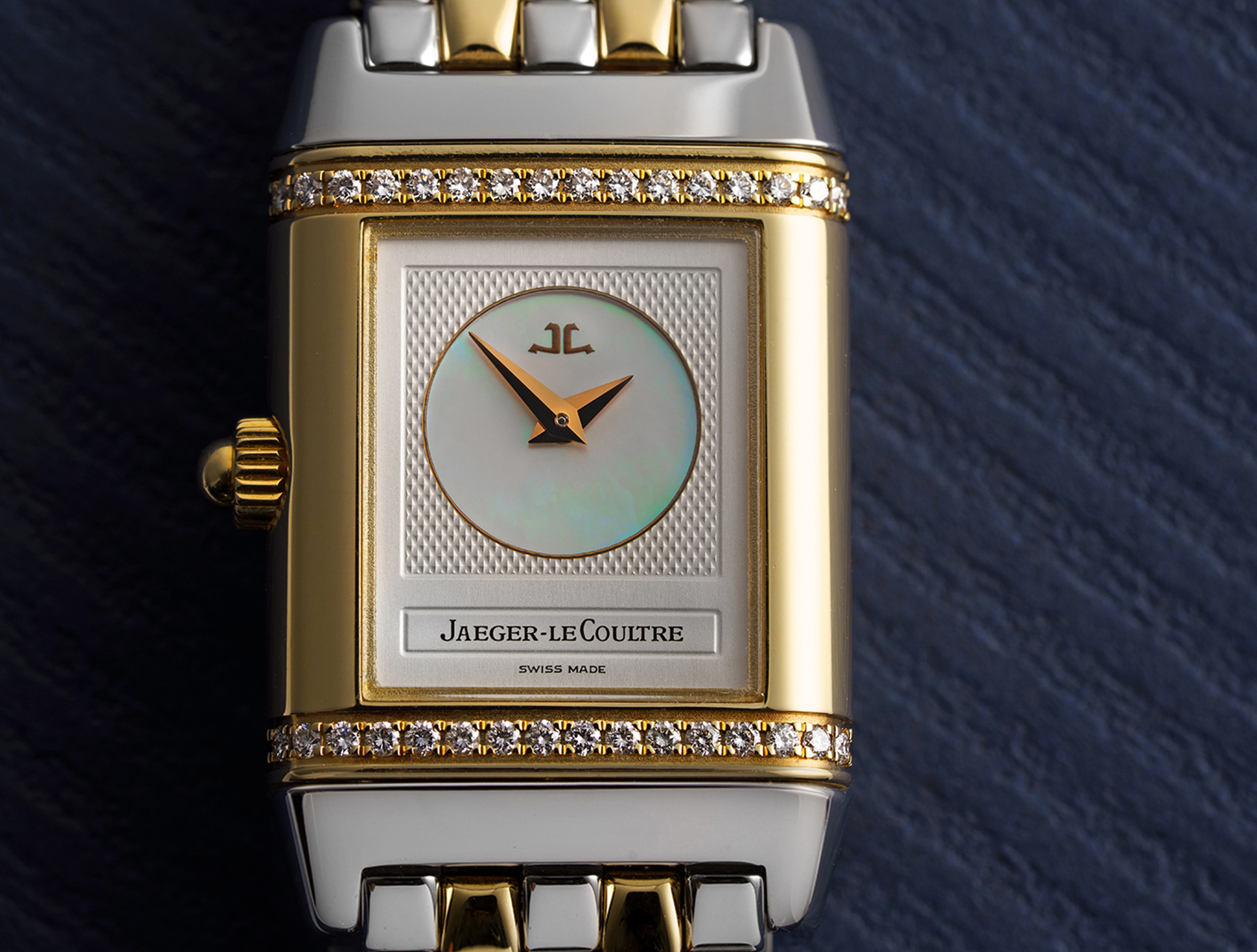 Within its 21 x 33mm 18ct gold case, the primary dial features a silvered guilloché surface with crisp black Arabic numerals. Flip the case around to reveal the second dial, a mother-of-pearl disc framed by textured guilloché and accented with diamonds along the top and bottom - a discreet transition from day to night.