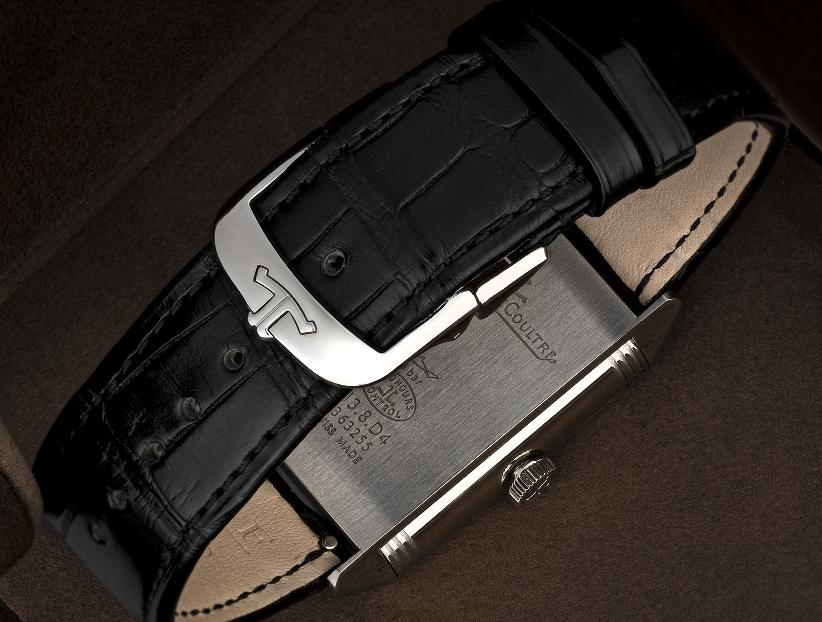Powered by JLC's hand-wound calibre 854A/2, fitted to a new black alligator JLC strap, and presented by our two-year international warranty. Accompanied by its Tourneau (Bucherer) receipt of purchase, and JLC travel case.