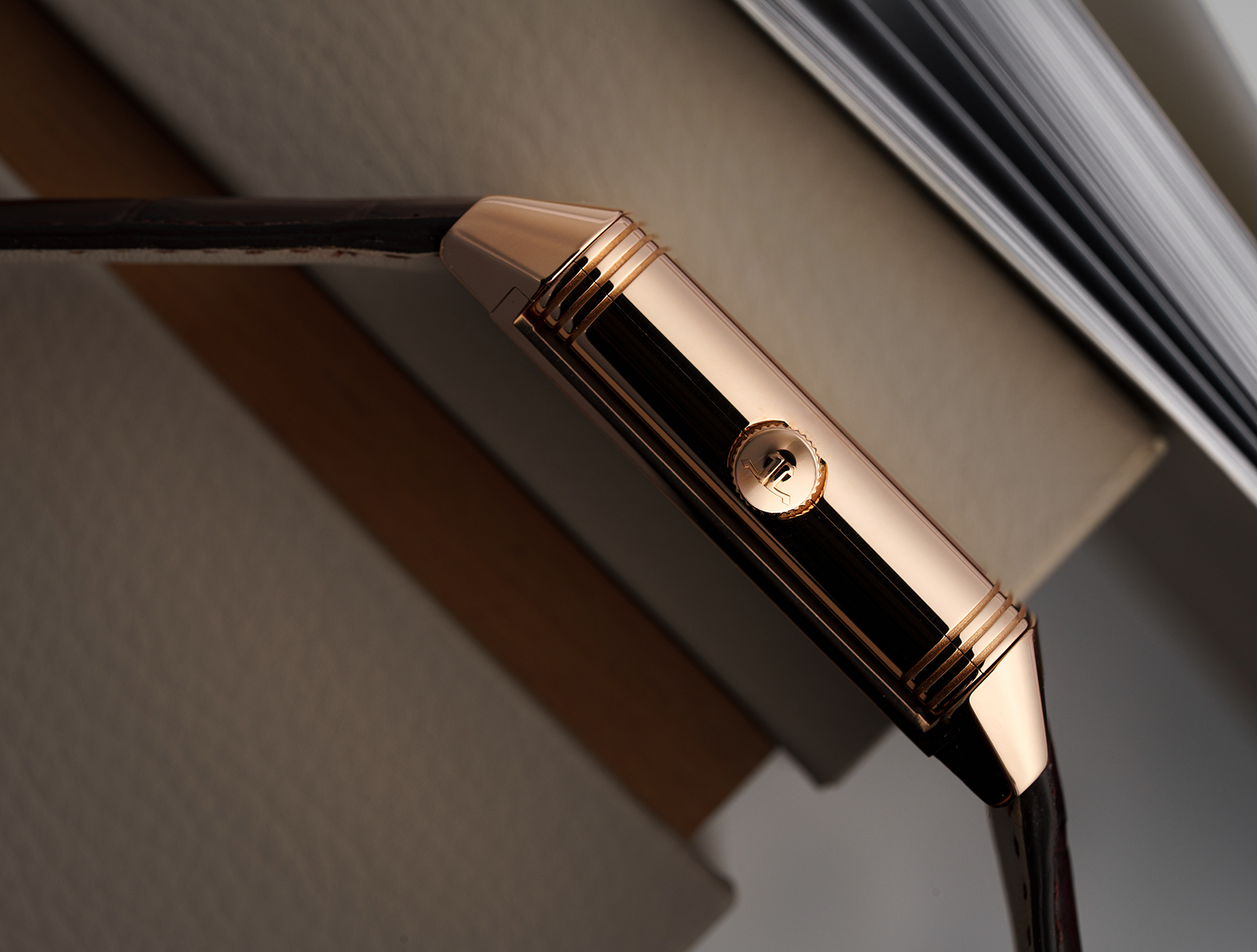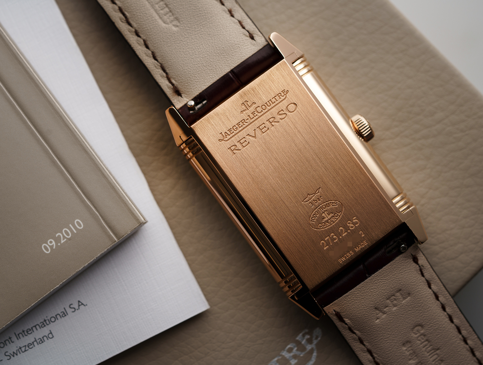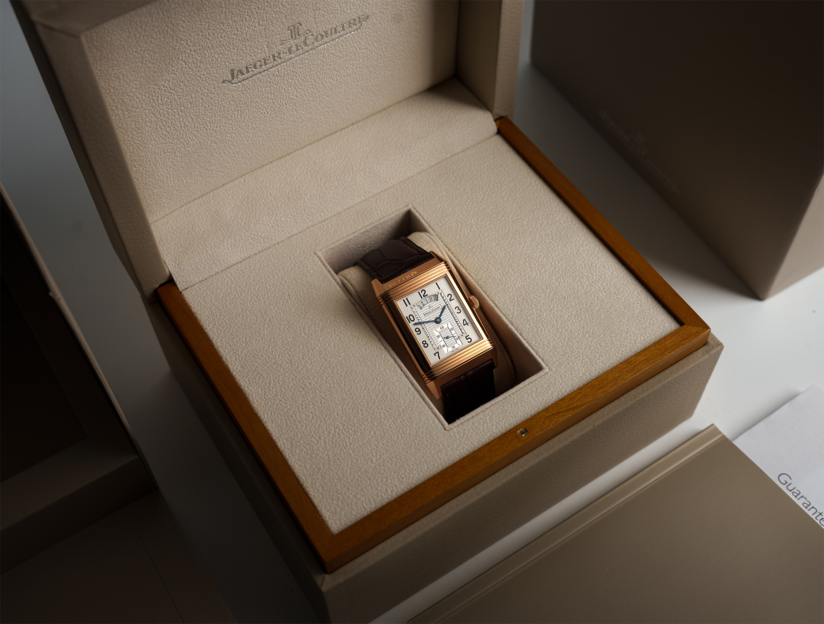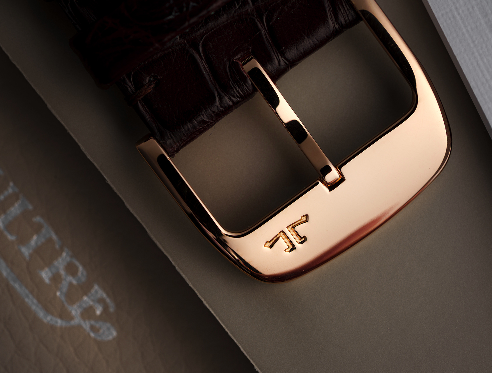 Fitted to a brand new rich brown JLC alligator strap that complements the warmth of the rose gold case, and secured with its matching 18ct rose gold JLC pin buckle.