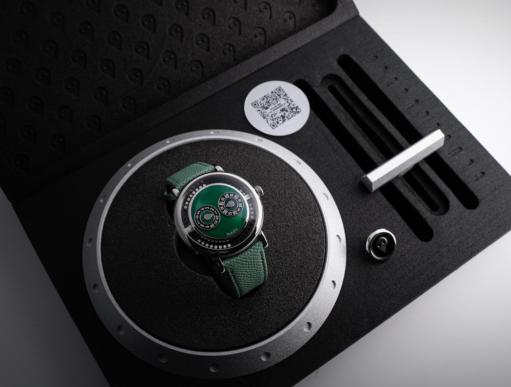 Originally offered exclusively to friends and supporters of MB&F, the MAD 2 was never available through traditional retail channels. The result is a cult timepiece that remains fiercely sought-after, especially in this striking green configuration, complete with its futuristic presentation case and accessories.