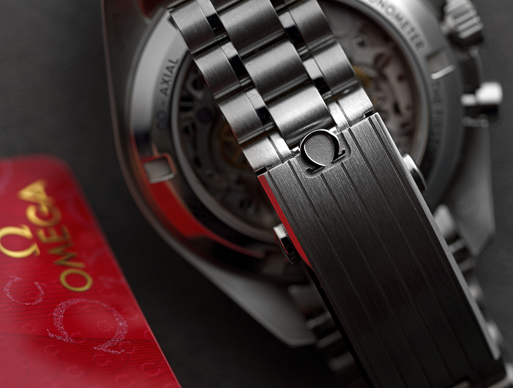 The 42mm case is crafted from corrosion-resistant 316L stainless steel and features a black stepped dial with an applied Omega logo and the signature “Dot Over 90” detail on the anodised aluminium bezel. Sapphire crystal on both the front and caseback reveals the manually wound Omega Co-Axial Calibre 3861 movement with a 50 hour power reserve.