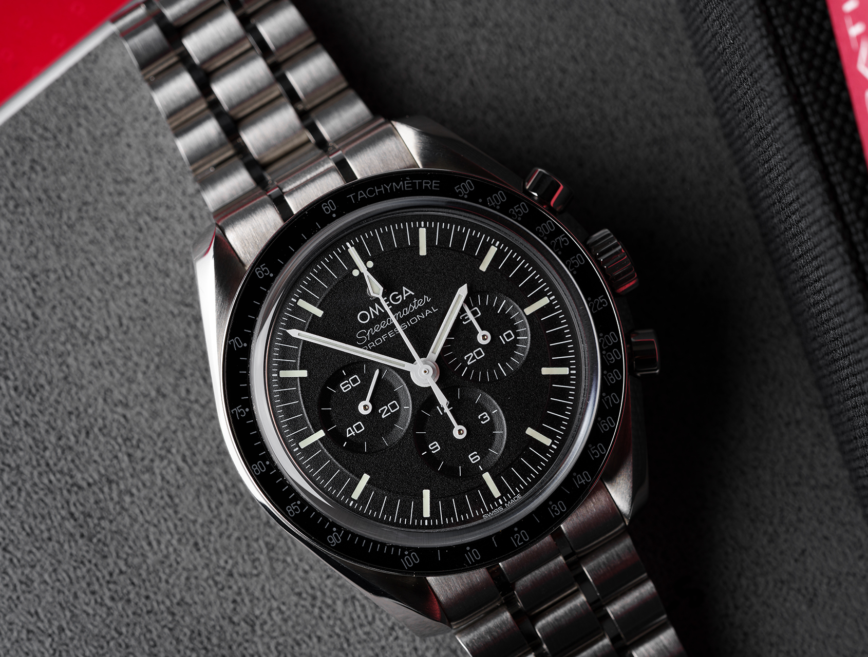 Purchased from Abu Dhabi in 2024, and in an outstanding and unpolished condition- this is the Omega Speedmaster Moonwatch “Sapphire Sandwich”.