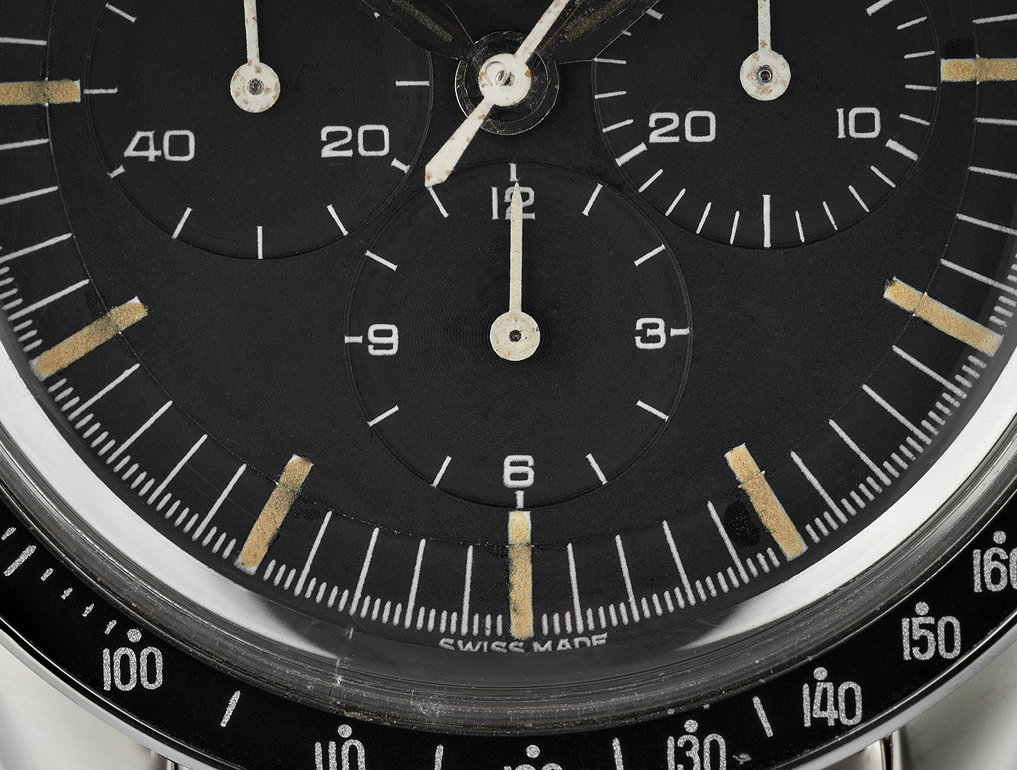 The charcoal-grey stepped dial has developed a lovely rich texture through natural aging. It enhances the appeal of the radium hour markers (which drape over the step as they should) and the Alpha hands, both having developed deep caramel tones. Applied metal Ω logo at 12, "swiss made" designation at 6, and the final series to feature the silver rehaut between the etched Hesalite crystal and dial. Fitted to its correct 7912 flat link bracelet (also in great condition), fitted with a slightly later dot next to 90 bezel insert, and powered by Omega's archetypal hand-wound calibre 321. Guaranteed for two years.