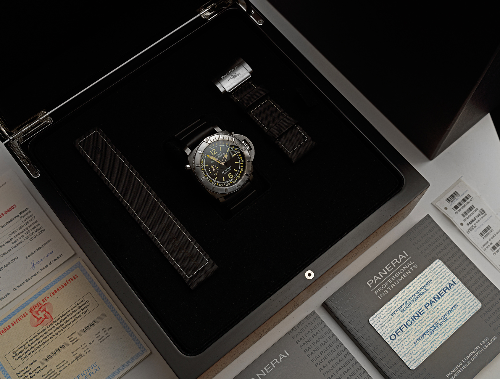 Powered by Panerai’s automatic OP XV calibre, fitted to a durable Panerai rubber strap with brushed steel pin buckle. Complete with its wooden Panerai box, instruction manuals, COSC certification, Calibration Certificate, an additional textile strap & clasp, and its Panerai Warranty card dated June 2009. Under our 2 year warranty.