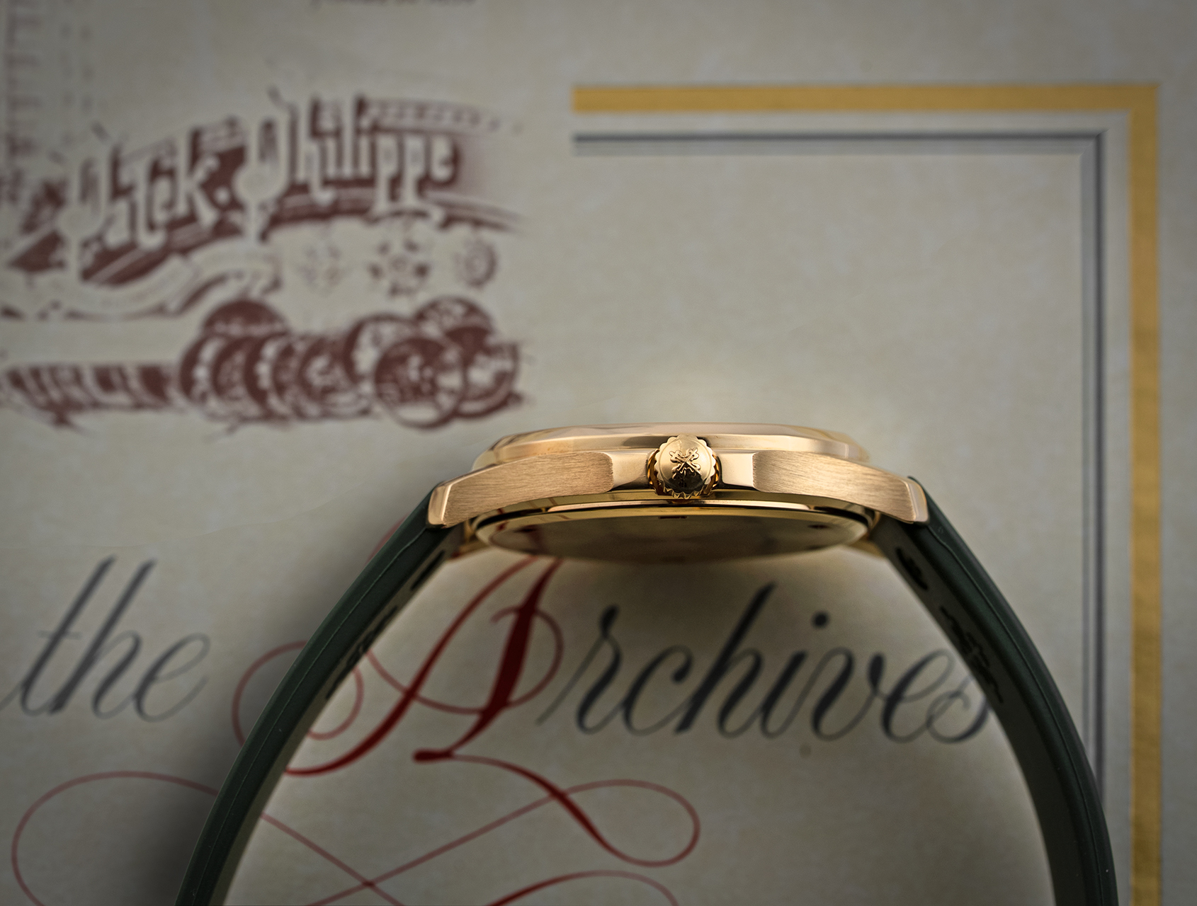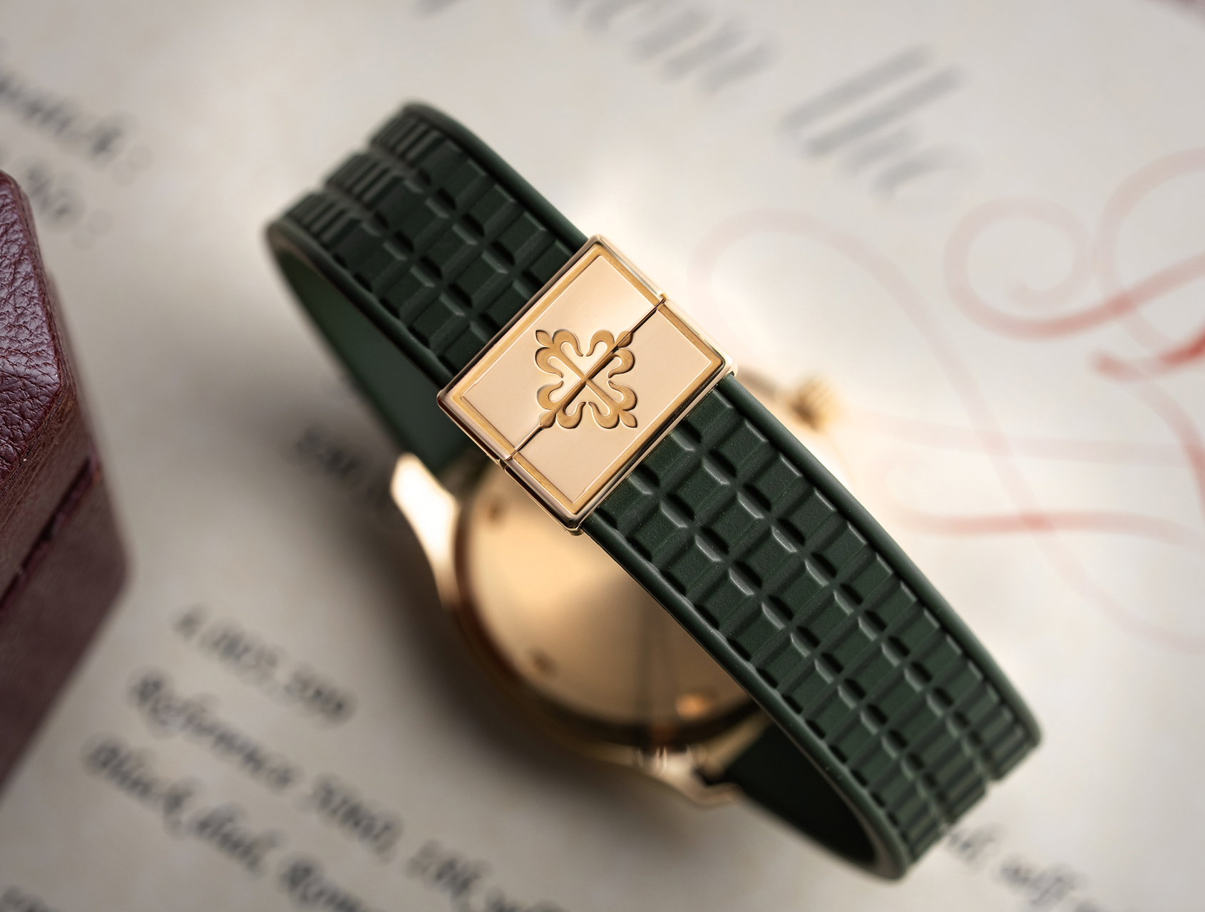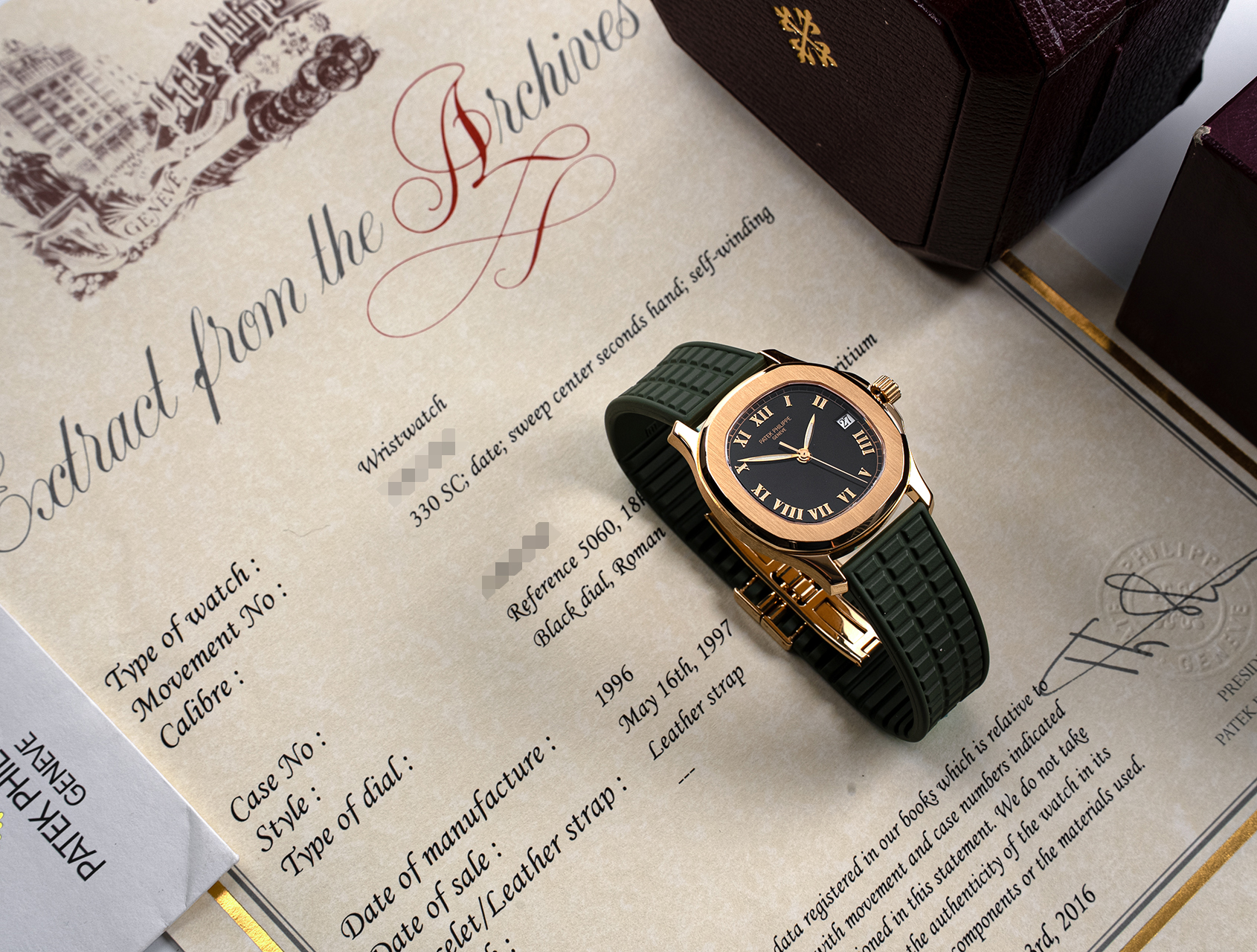 Cased in 18-carat yellow gold, this early Aquanaut displays the instantly recognisable rounded-octagonal bezel, the deep black lacquer dial is uniquely appointed with applied Roman numerals, gilt minute track, and luminous feuille hands, details found only on this first reference. Fitted to the hottest strap in the game; the khaki Patek Philippe tropical rubber strap, with double folding gold Calatrava clasp. Patek’s self-winding calibre 330 SC.