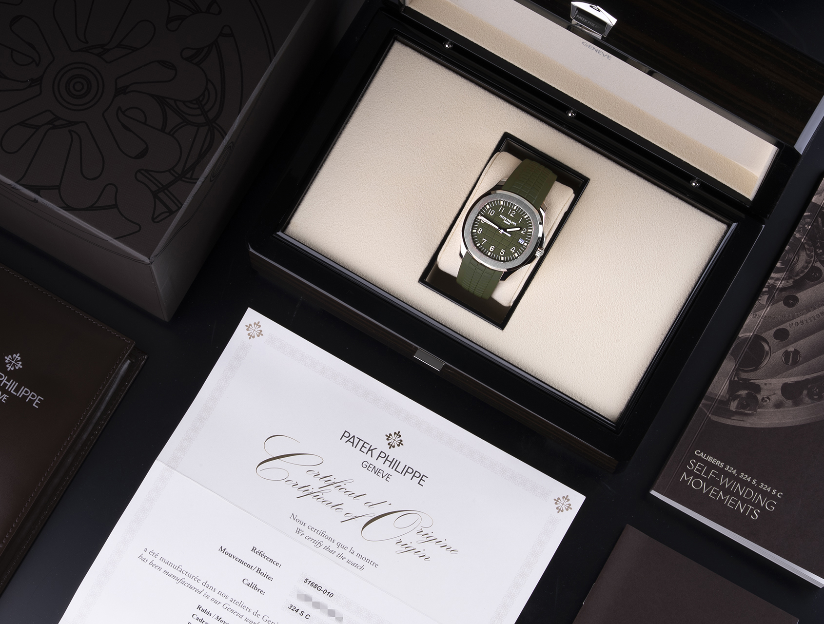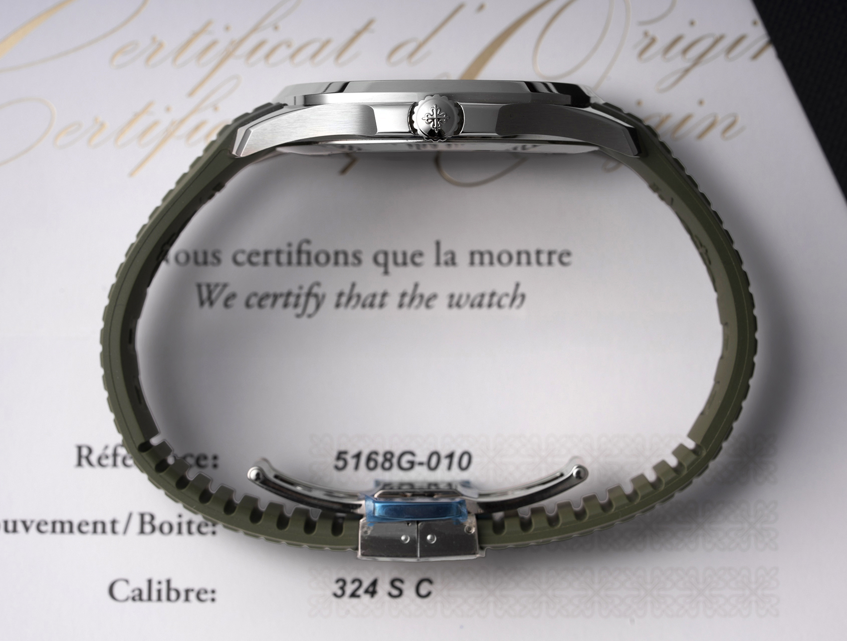 One of the only white gold ref. 5168 Aquanauts offered completely brand new & unpolished as the day it left the Patek factory in Geneva (still retaining factory stickers on the clasp).
