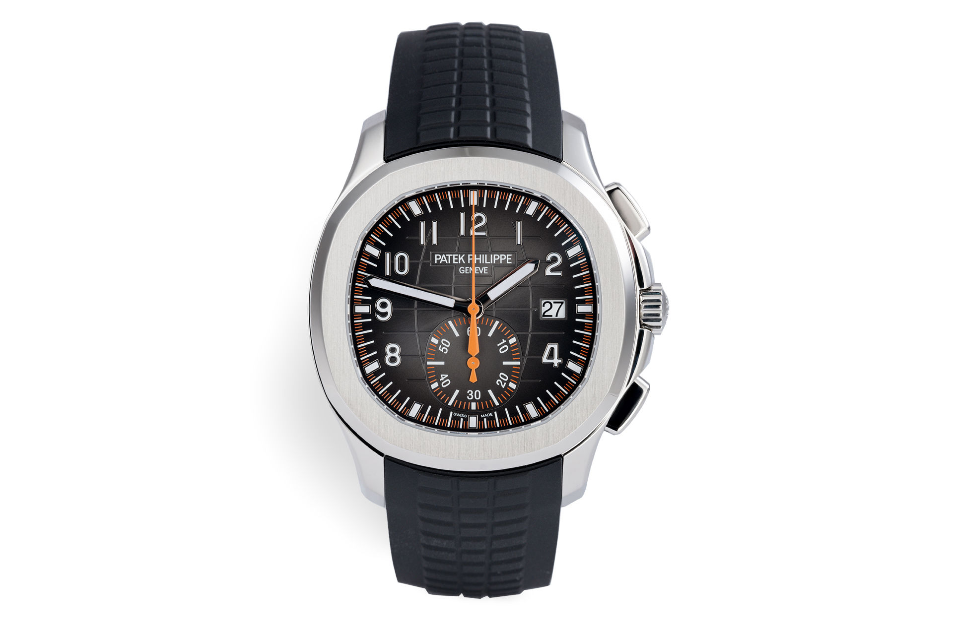 Brand new and never worn, this is the very latest, and boldest release from Patek, the new Aquanaut Chronograph in stainless steel! Factory fresh, this UK retailed watch is complete with its original Patek polished wooden box, Certificate of Origin, booklets, stylus and additional orange Tropic strap that references the accent flashes in the hands and dial. Not available from Patek retailers anywhere, the 5968A-001 has already proved itself the most sought after new release in Patek's history!