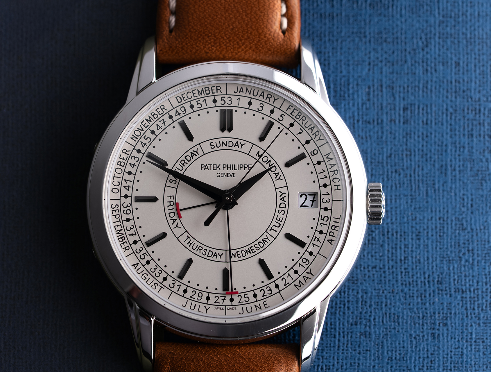 A contemporary round 40mm case with beautiful stepped lugs (inspired by historical Pateks) with silvery-opaline dial, displaying its complication - the weekly calendar. A semi-integrated mechanism that indicates the current week number, in addition to the day and date, the exclusive handwritten typeface is unique to this reference.