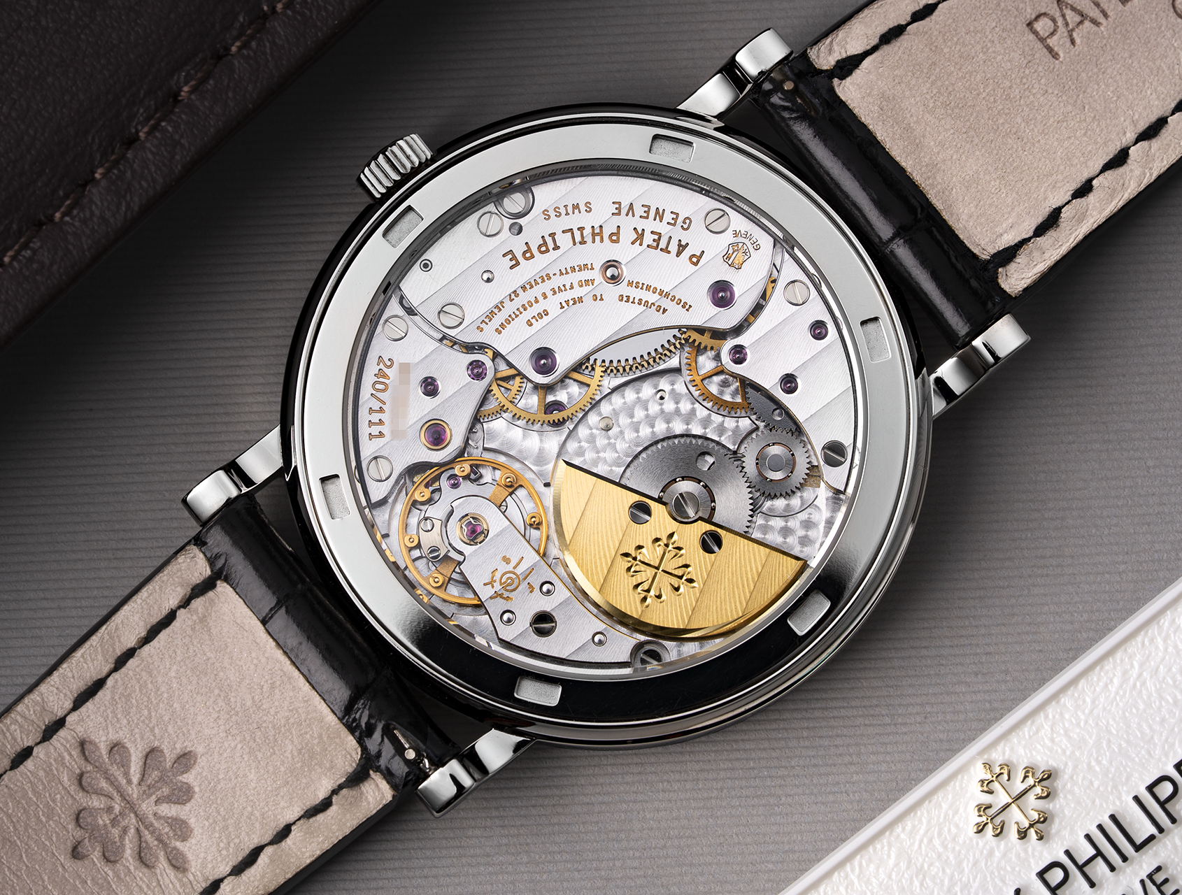 This ultra-slim self–winding dress watch with 'Clous de Paris' hobnail bezel represents an evolution of Patek's archetypal Calatrava. Debuted in 2001, it replaced the classic reference 3919.