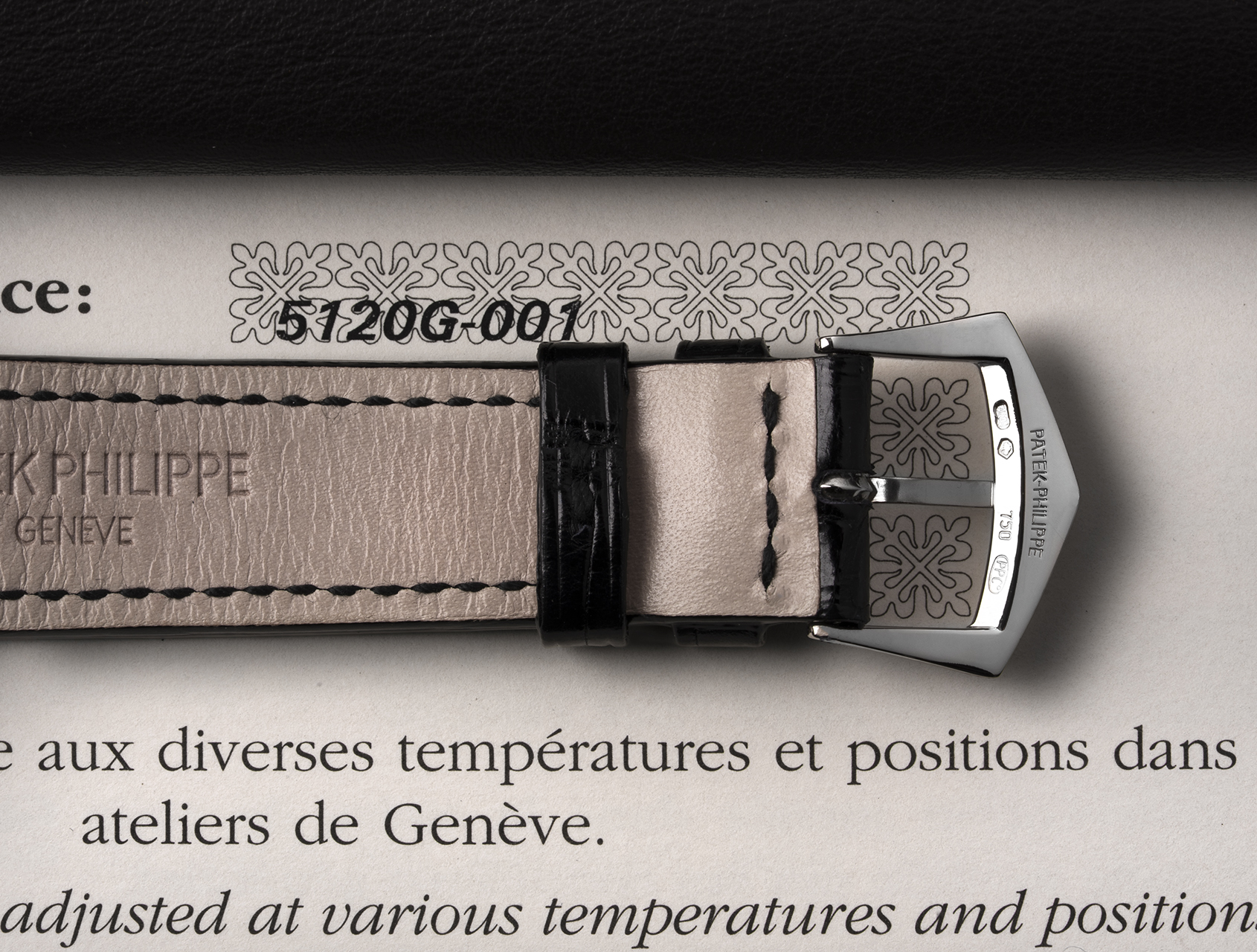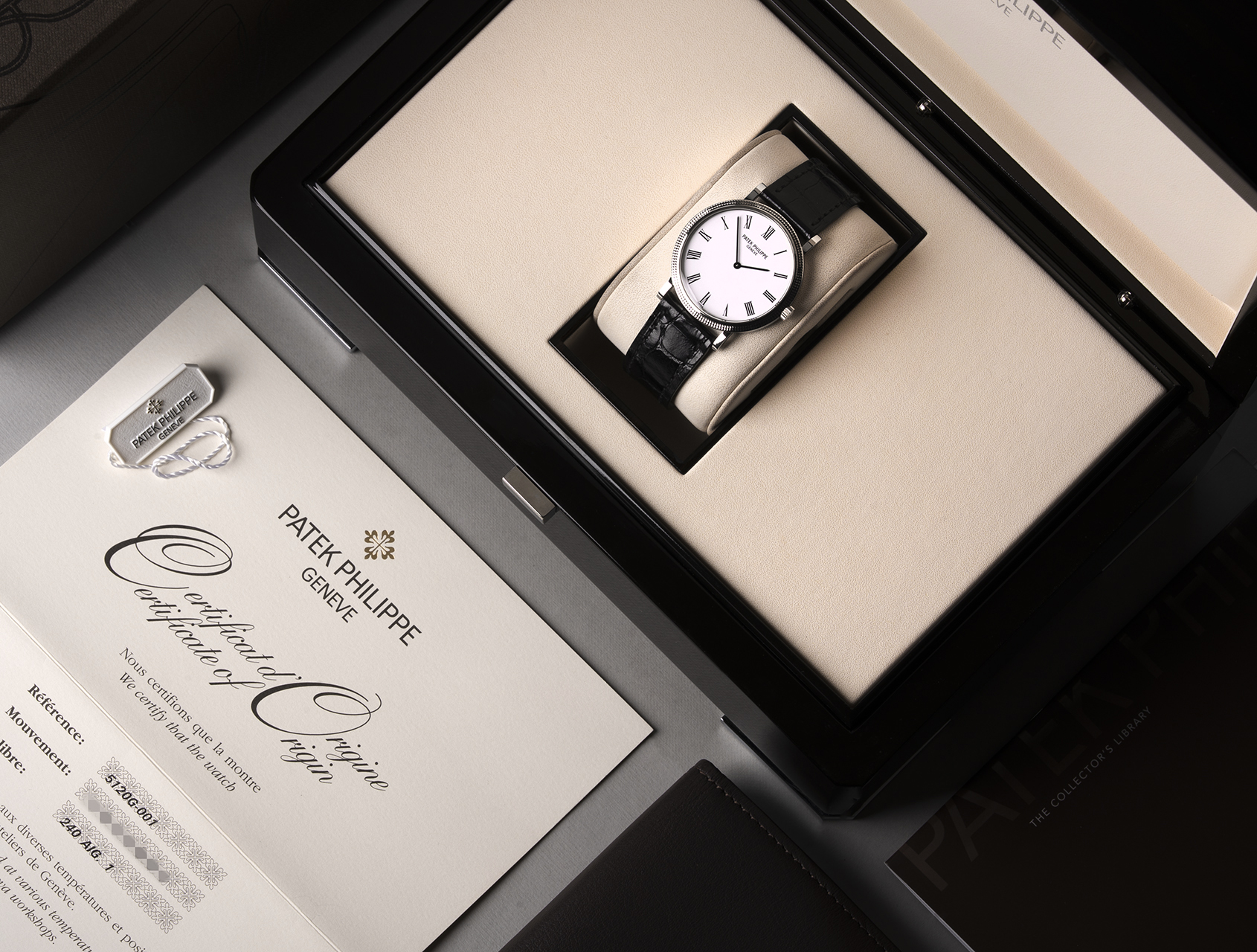 Beautifully captured in this set of images, this gentlemen's white gold Calatrava ref. 5120G is accompanied by its Patek Philippe box, literature booklets, swing tag, and Patek certificate dated October 2008.