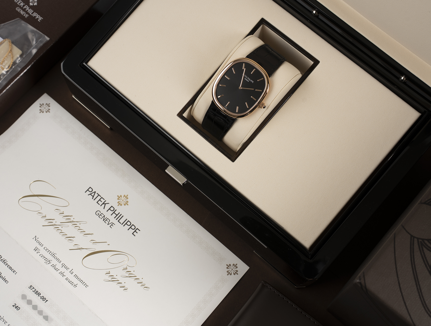 In 2018, to celebrate the 50th anniversary of this iconic model, Patek Philippe created this rose gold ultra-thin Jumbo version (measuring 34.5 x 39.5mm) with an ebony black sunburst dial and slender applied rose gold hour markers & hands. The slim self-winding movement has a 48hr power-reserve, and is water resistant to 30m. UK retailed in 2020, our example is in new condition and complete with its polished wood Patek box, operating instructions and Patek Philippe Certificate.