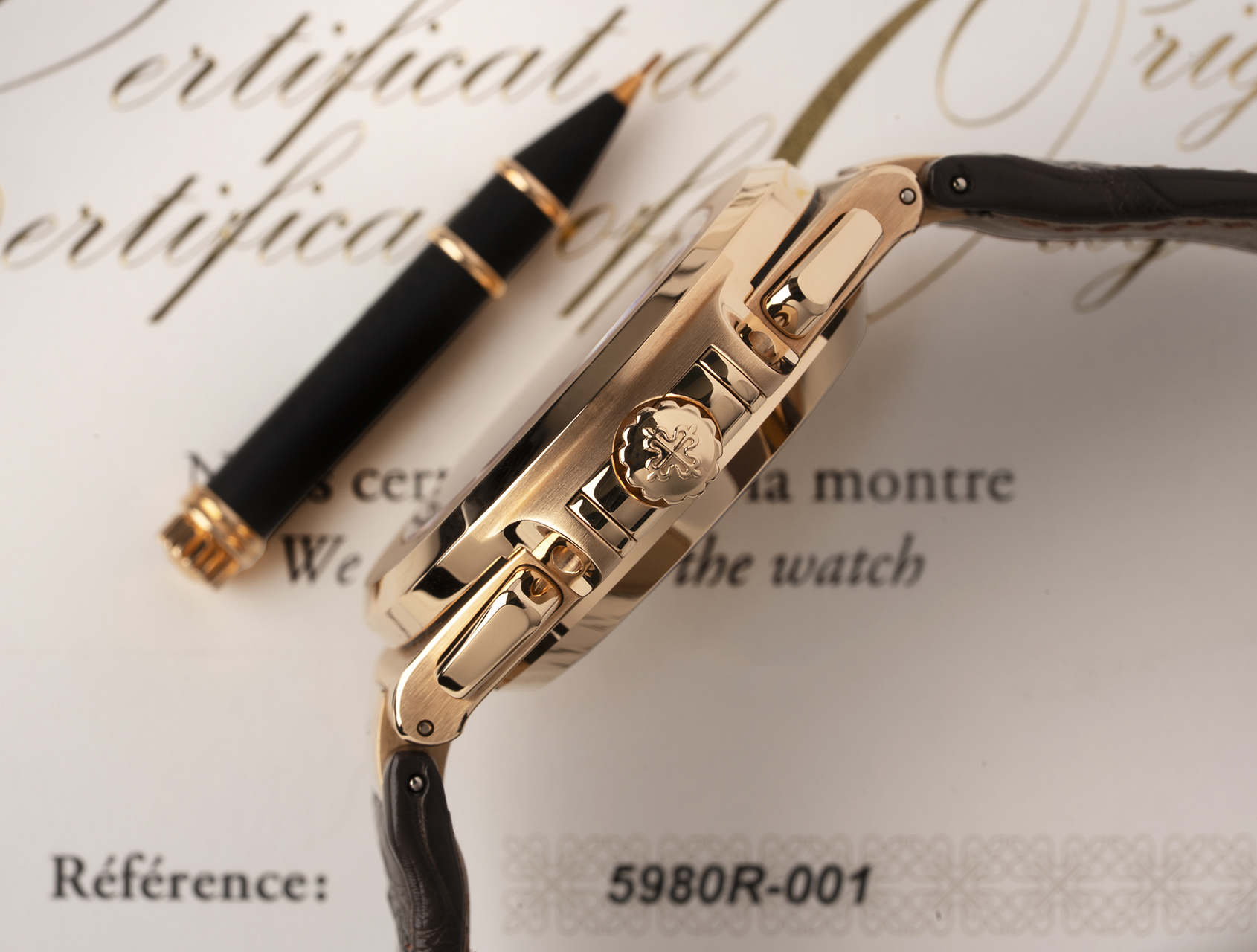 The Patek Philippe Nautilus 5980R is one of the most distinctive chronographs in the Nautilus line. The 18ct rose gold case is paired with an elegant brown alligator strap, making it slightly more versatile than its full-bracelet brother. With gold at an all-time high and demand for precious-metal sports watches growing ever stronger, the Nautilus 5980R is widely regarded as a cornerstone for any important collection.