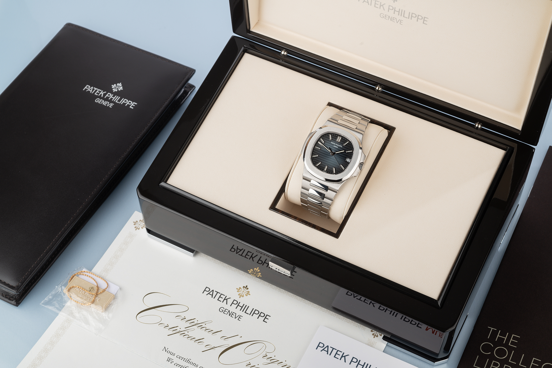 The most sought-after watch in the world, Patek's Jumbo Nautilus 5711/1A with the all important blue dial. In perfect condition this UK retailed stainless steel 40mm Nautilus is totally complete with its original Patek Certificate of Origin, wallet, booklets, and polished wooden box. Patek Philippe have officially closed their waiting lists world-wide some time ago, on all the steel sports watches, and this classic 40mm Jumbo is the cream of the crop.