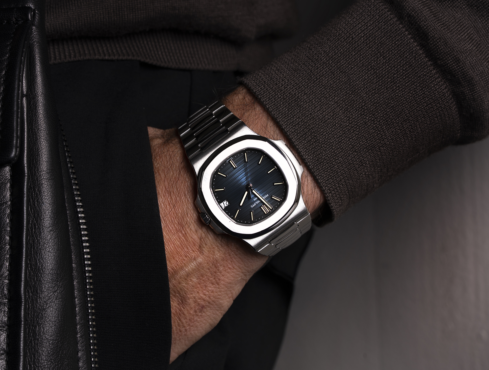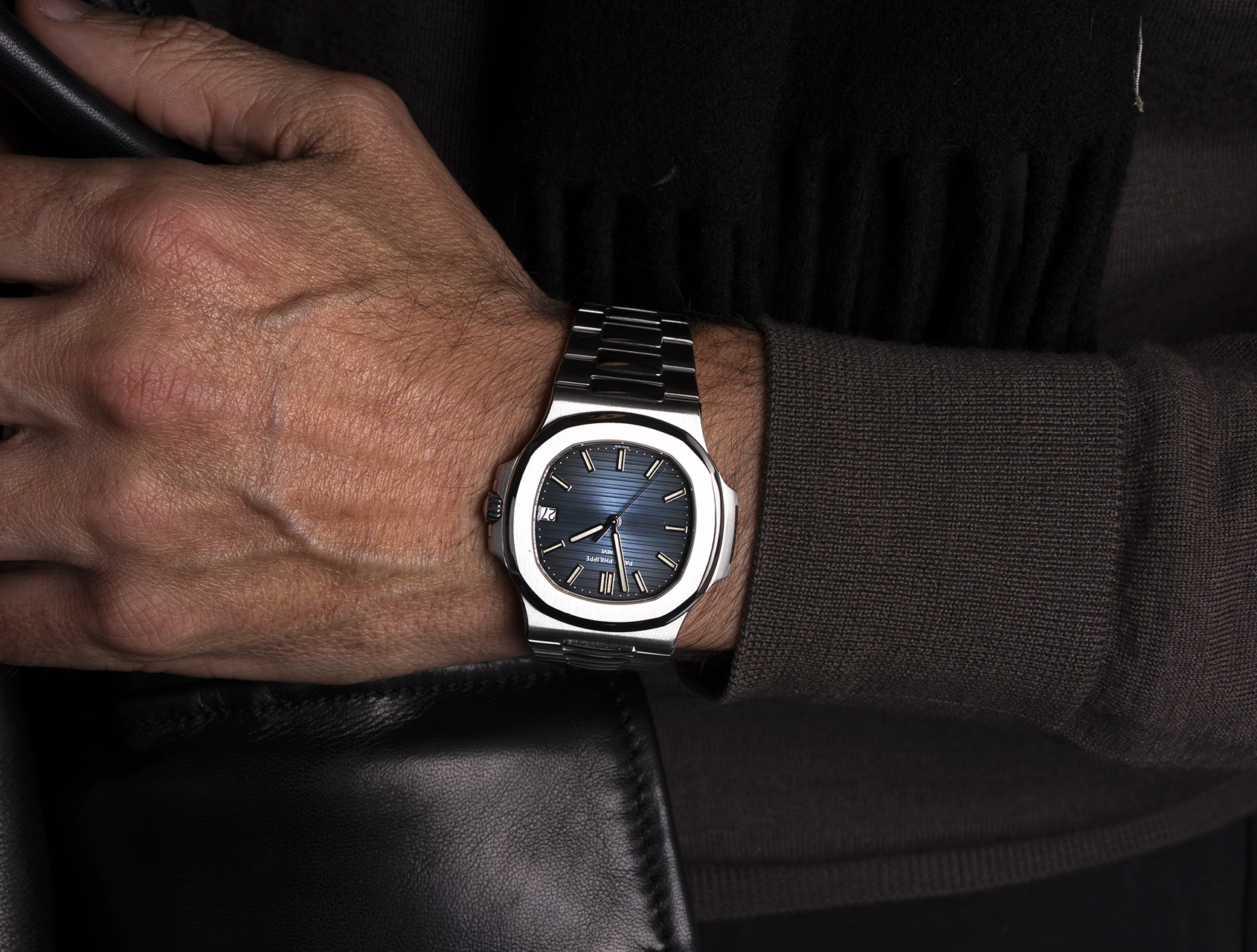 UK retailed at Watches of Switzerland in March 2007, worldwide demand for this 40.5mm steel Jumbo Nautilus 5711/1A-010 with dark blue embossed dial, is as strong now as ever. The industrial chic 3-part case design with integral bracelet, its comfort on the wrist, discreetness, plus its residual value, have made this the world's hottest luxury sports watch, and its waterproof to 100m!
