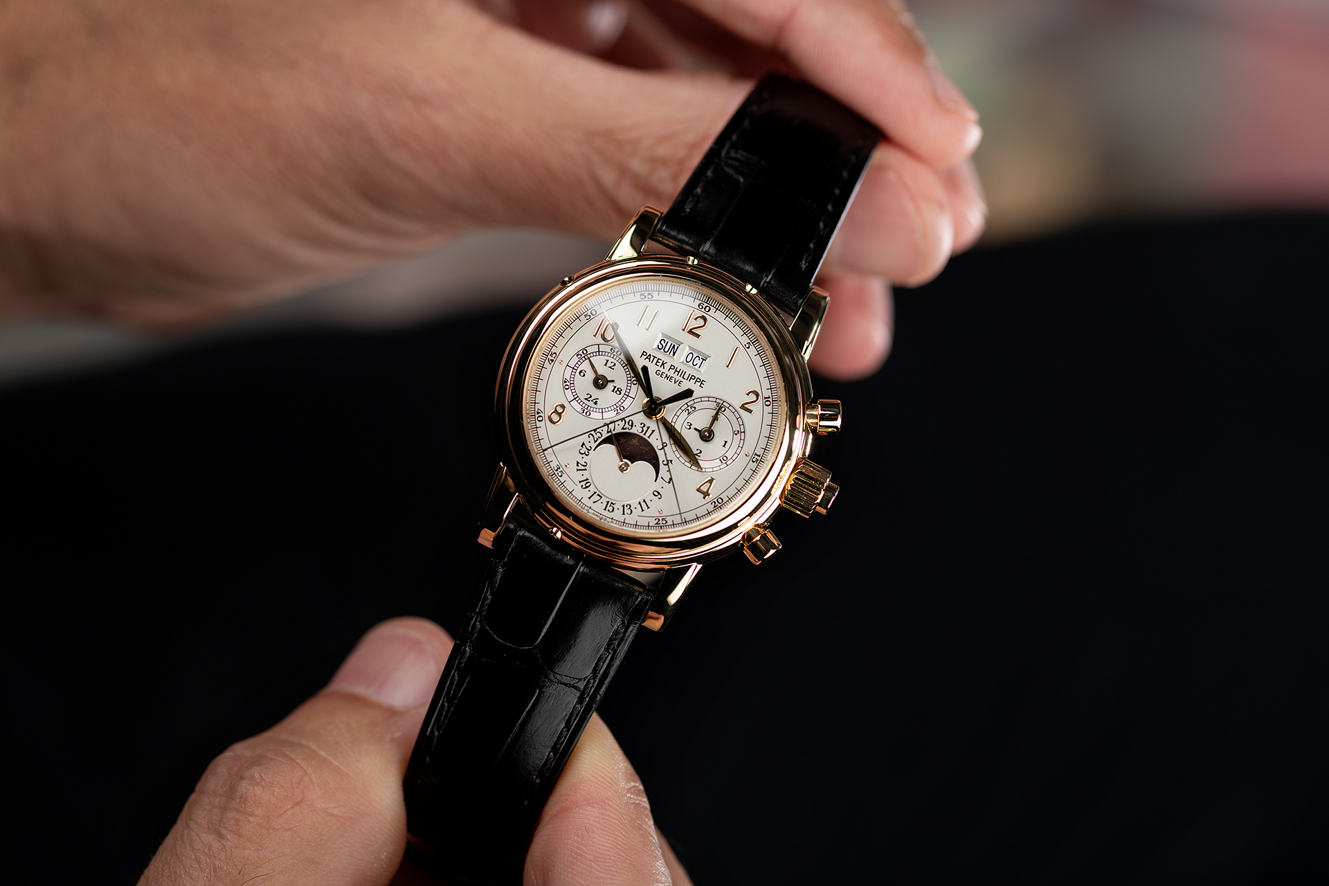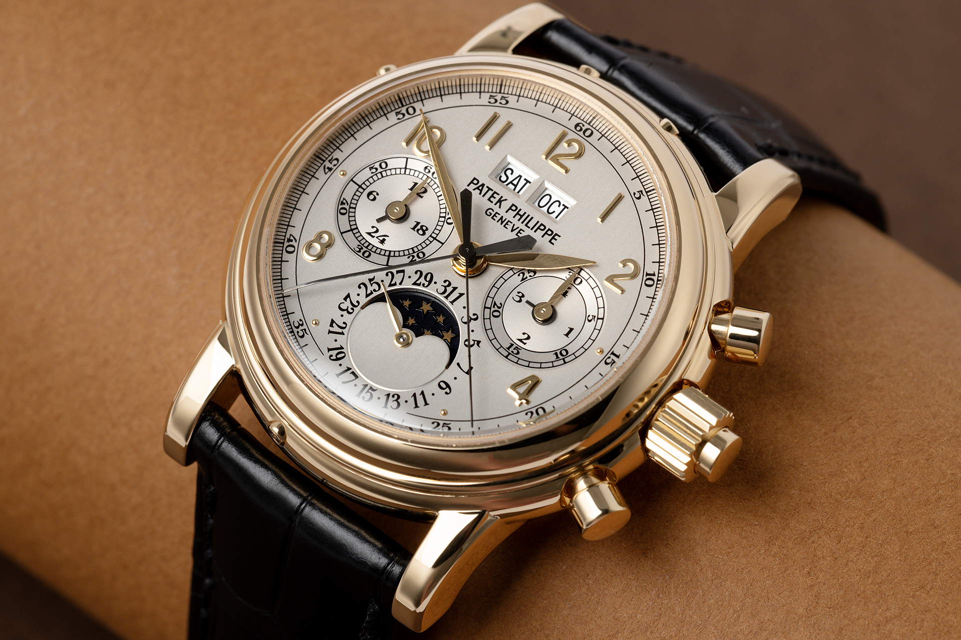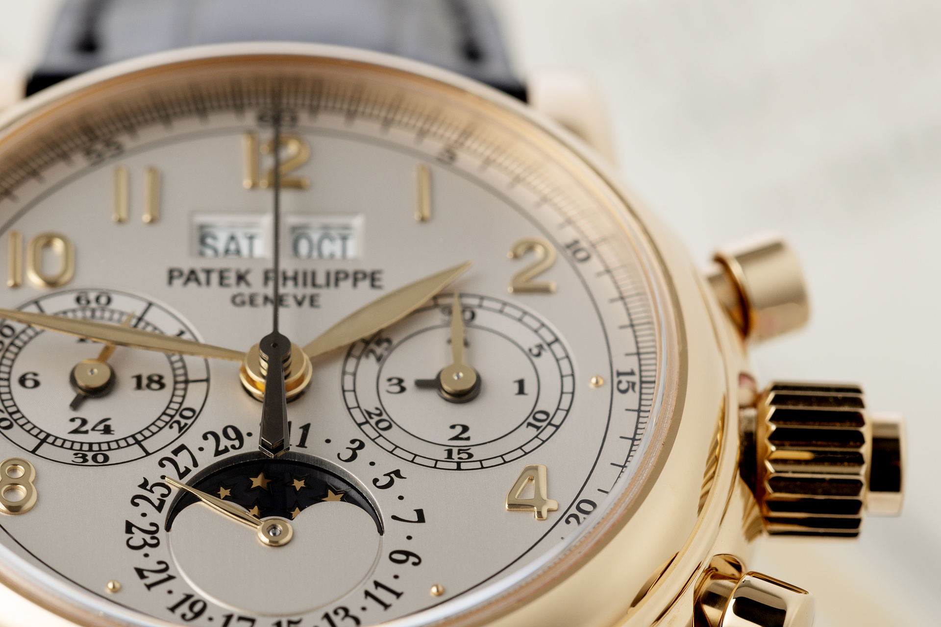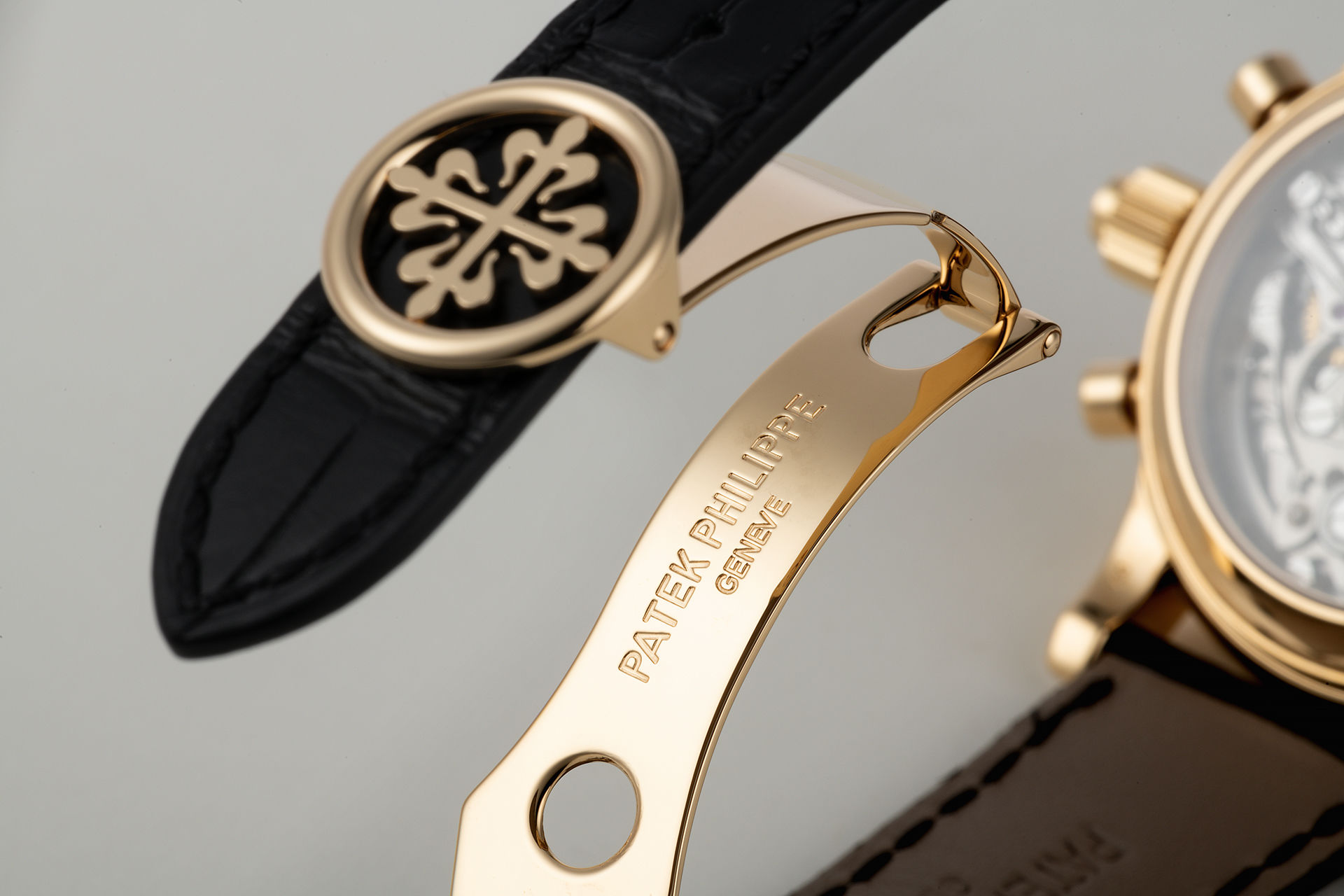 Combining a split-chronograph with perpetual calendar & moonphase, the 5004 is such a serious grand complication that Patek were only able to make 12 movements per year during its production run. Just back from a full service with Patek Philippe and under their 2 year warranty this extremely rare and important horological masterpiece is in 'like new' condition and perfectly sized at 36mm. Exquisitely classic with its 18ct yellow gold case, silver dial, applied gold numerals and brand new black alligator strap we are pleased to present this with its Patek service papers, extract from the Patek Philippe archives confirming its 2005 manufacture and sale, and its polished wood Patek Philippe box.