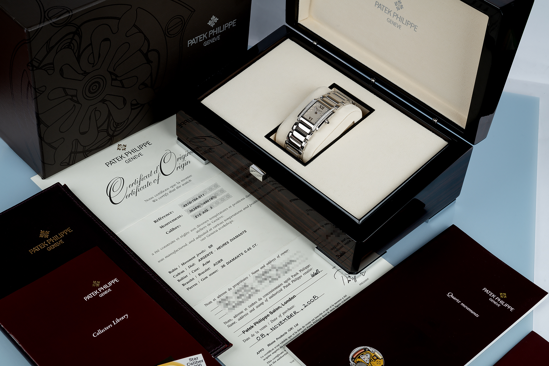 It's been 2 years since we last had a beautiful Patek Philippe Twenty-4 like this! In superb crisp condition, this elegant lady's watch is set with 46 brilliant white diamonds that complement the chic silver "timeless white" dial perfectly. Super elegant but also extremely tough thanks to the polished stainless steel case and bracelet, this ref. 4910 is totally complete with its original Patek polished wooden box, certificate of origin and booklets.