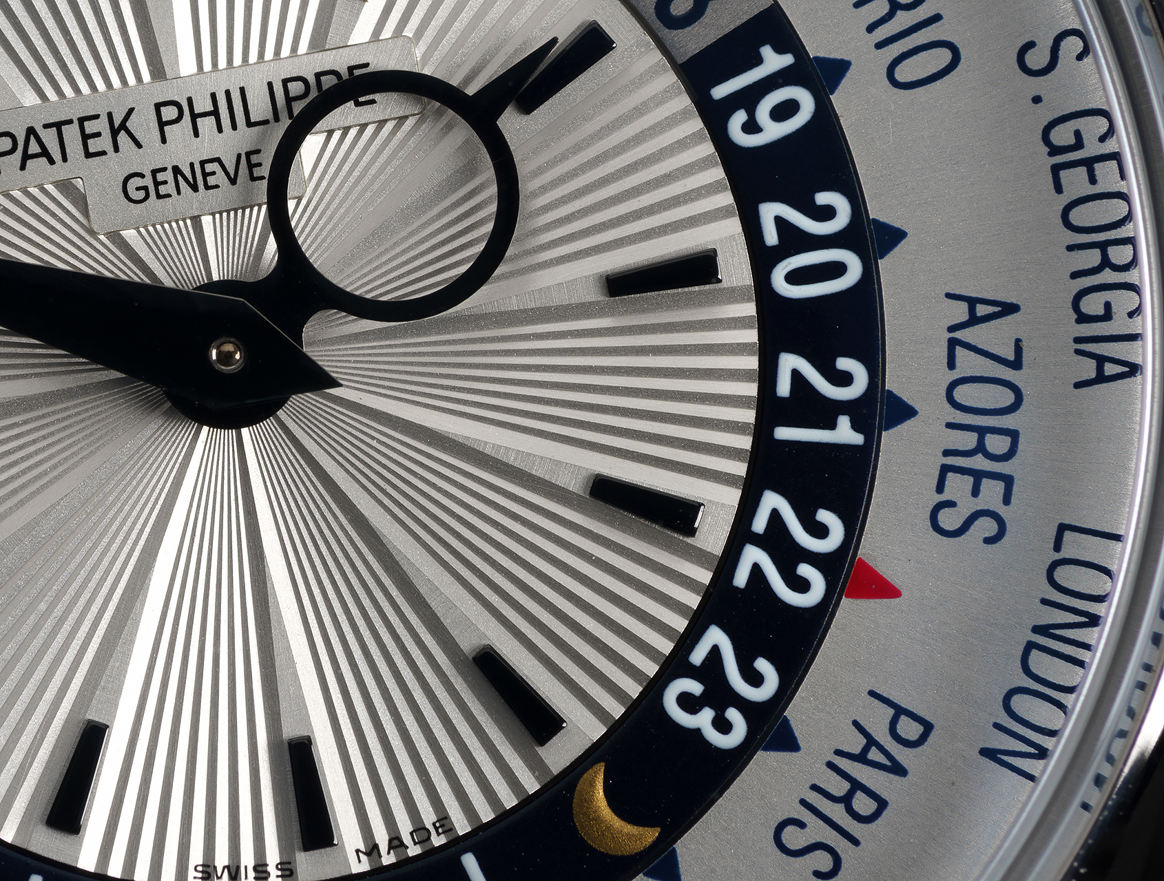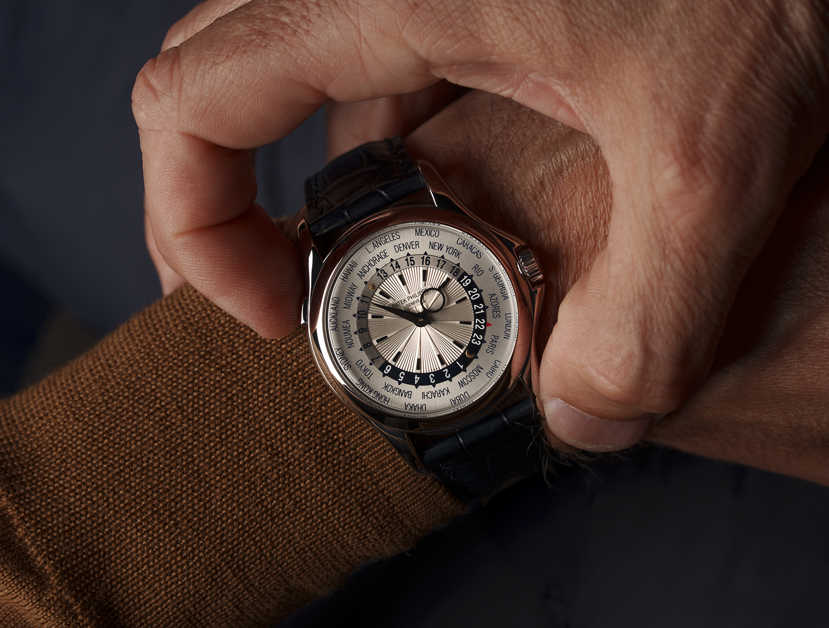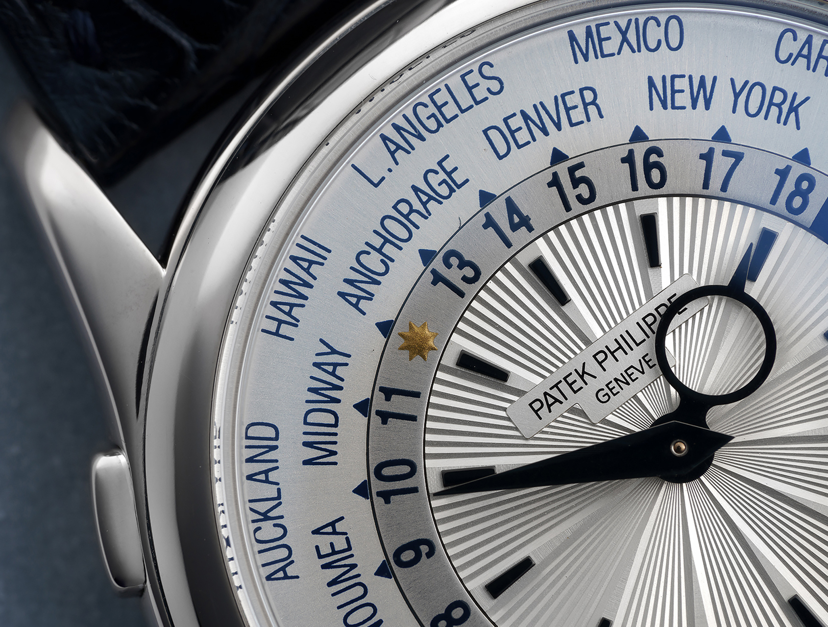 Historically important, the 5130G’s ingenious world-time mechanism dates back to the 1930's, when, at Patek's behest, independent Swiss watchmaker Louis Cottier created an ultra-slim system that could display the time across global cities using a concentric rotating 24-hour ring. This was later patented by Patek in 1957 and reintroduced as a further enhanced movement in 1999. This present example is powered by Patek's in-house self-winding calibre 240 HU (Heure Universelle) with micro rotor, waterproof to 30m and is fitted to a dark blue Patek strap with white gold Patek pin buckle. This World Time is guaranteed for 2 years.