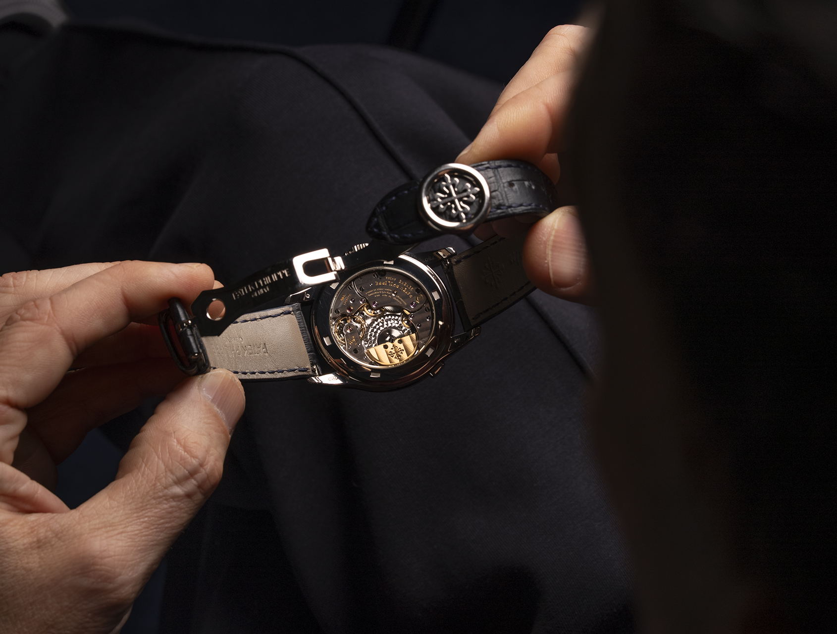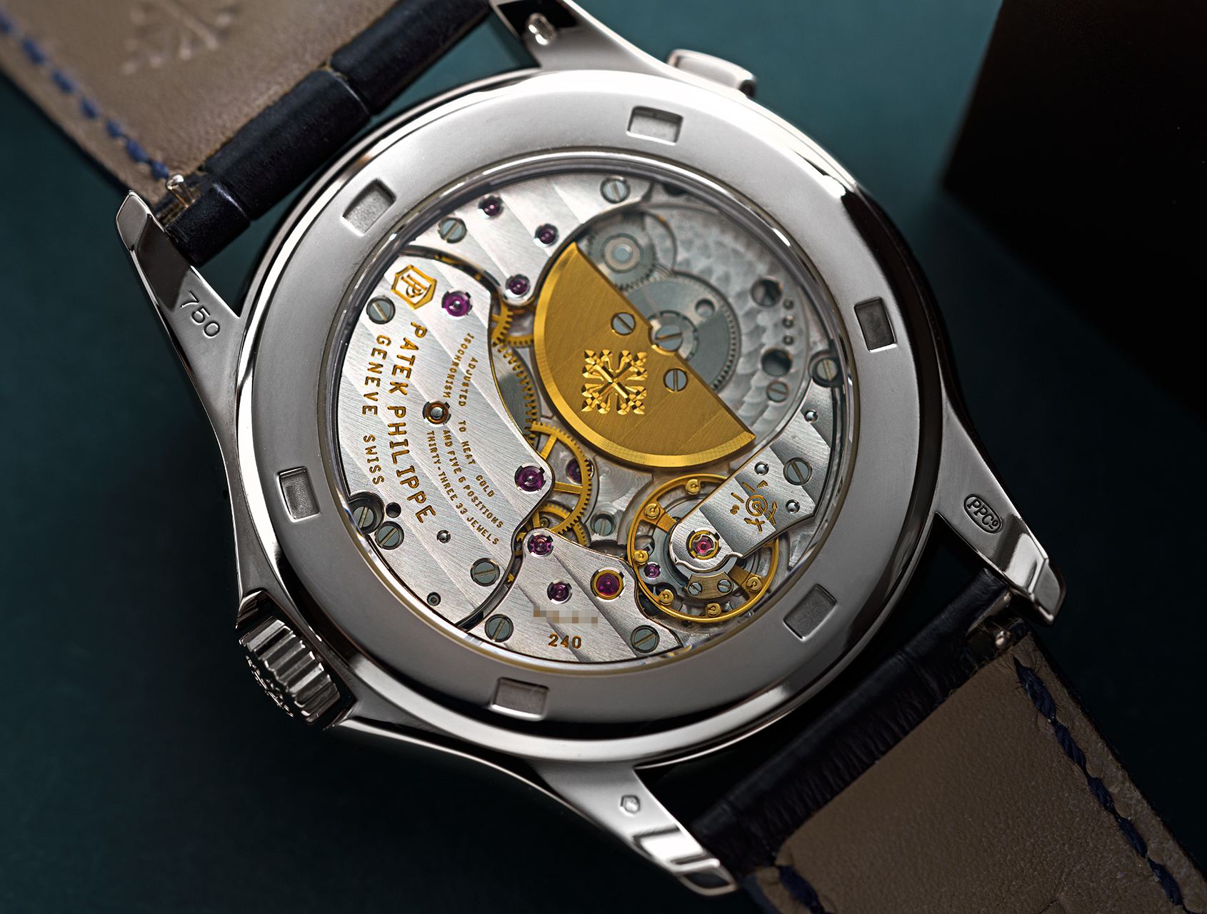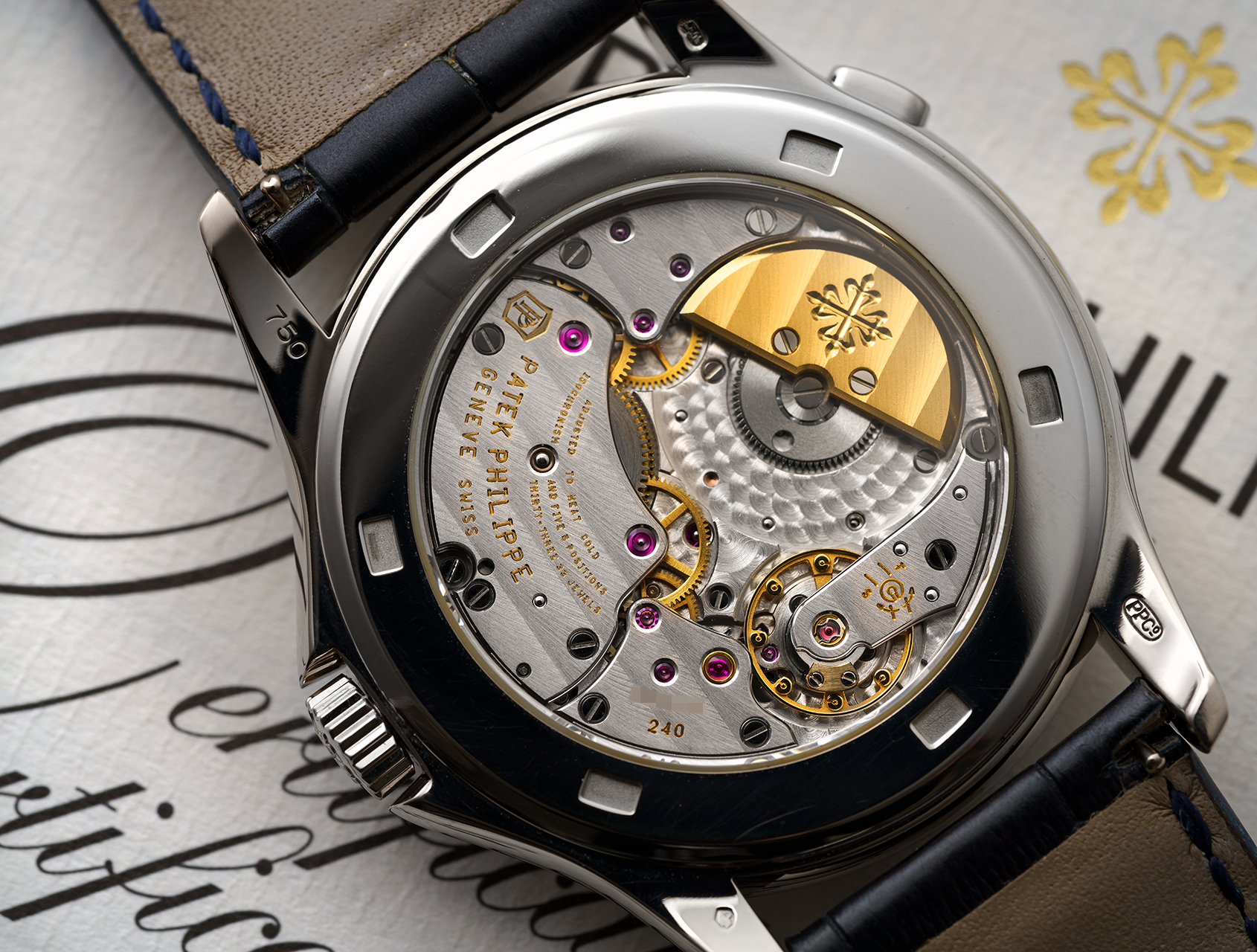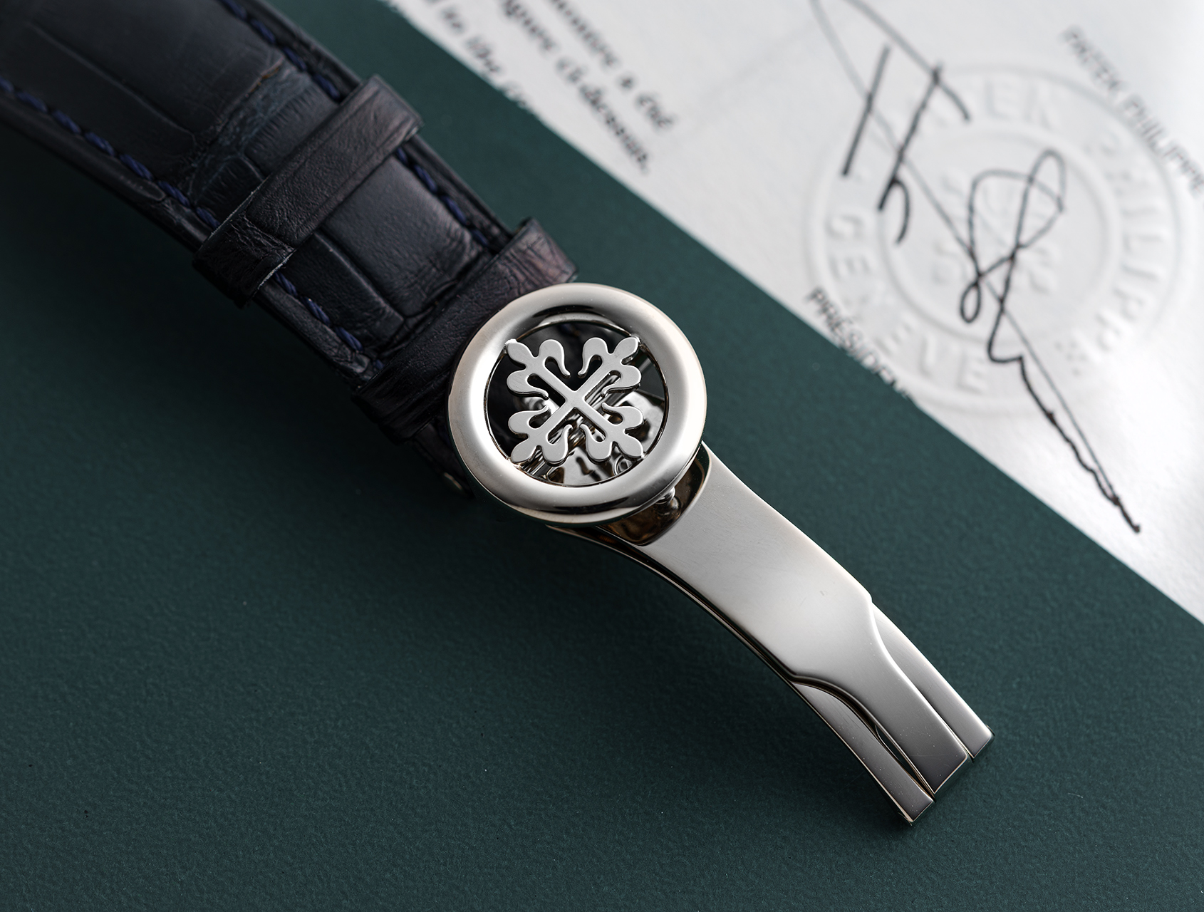 Visible through the sapphire case back is the self-winding calibre 240HU with 48 hour power reserve, water resistant to 30m. Secured by a navy alligator Patek strip and 18ct white gold Patek Philippe deployant clasp with Calatrava cross.