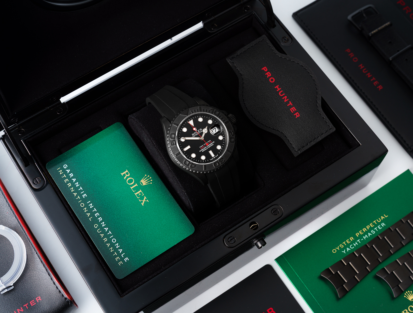 The stainless steel case, clasp, and platinum bezel have all had the full Pro Hunter 'Diamond-like Carbon' treatment, with a stealth matte finish. Each piece has its own issue number, with ours being 003, engraved on the caseback. The dial now features the Pro Hunter logo at 6, and its second hand & 'Yacht-Master' print stand-out in bright red. Fitted to a black rubber Pro Hunter strap, accompanied by its DLC-coated Oyster bracelet. Waterproof to 100m.