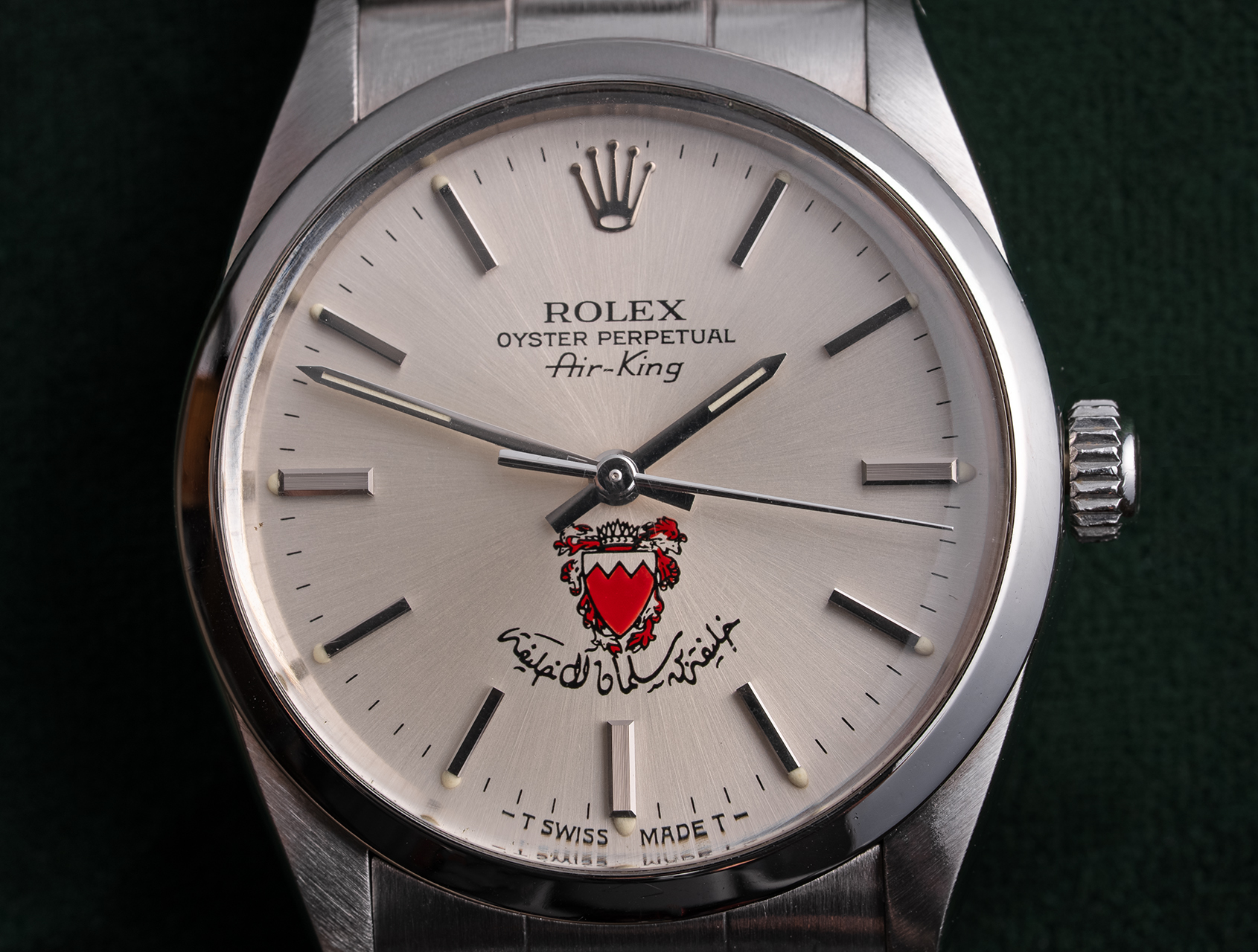 Extremely rare and coveted crested dial Air-King from 1988, with special presentation Bahrain Rolex box.