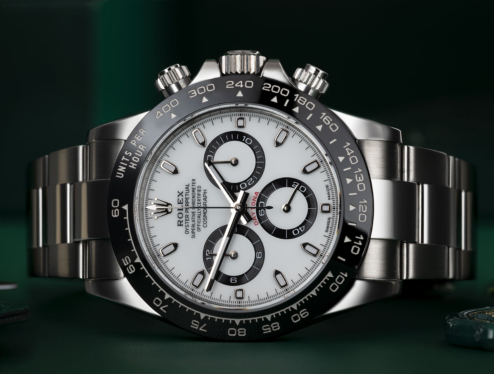 UK retailed at Mappin & Webb in 2023, this white dial Panda Daytona ref. 116500LN with black Cerachrom bezel, is under Rolex international warranty until February 2028.