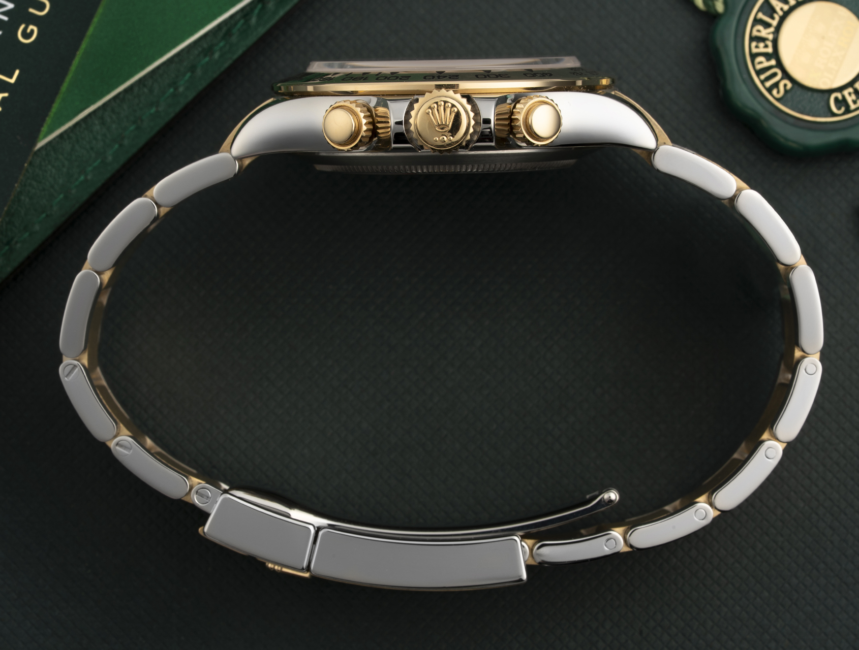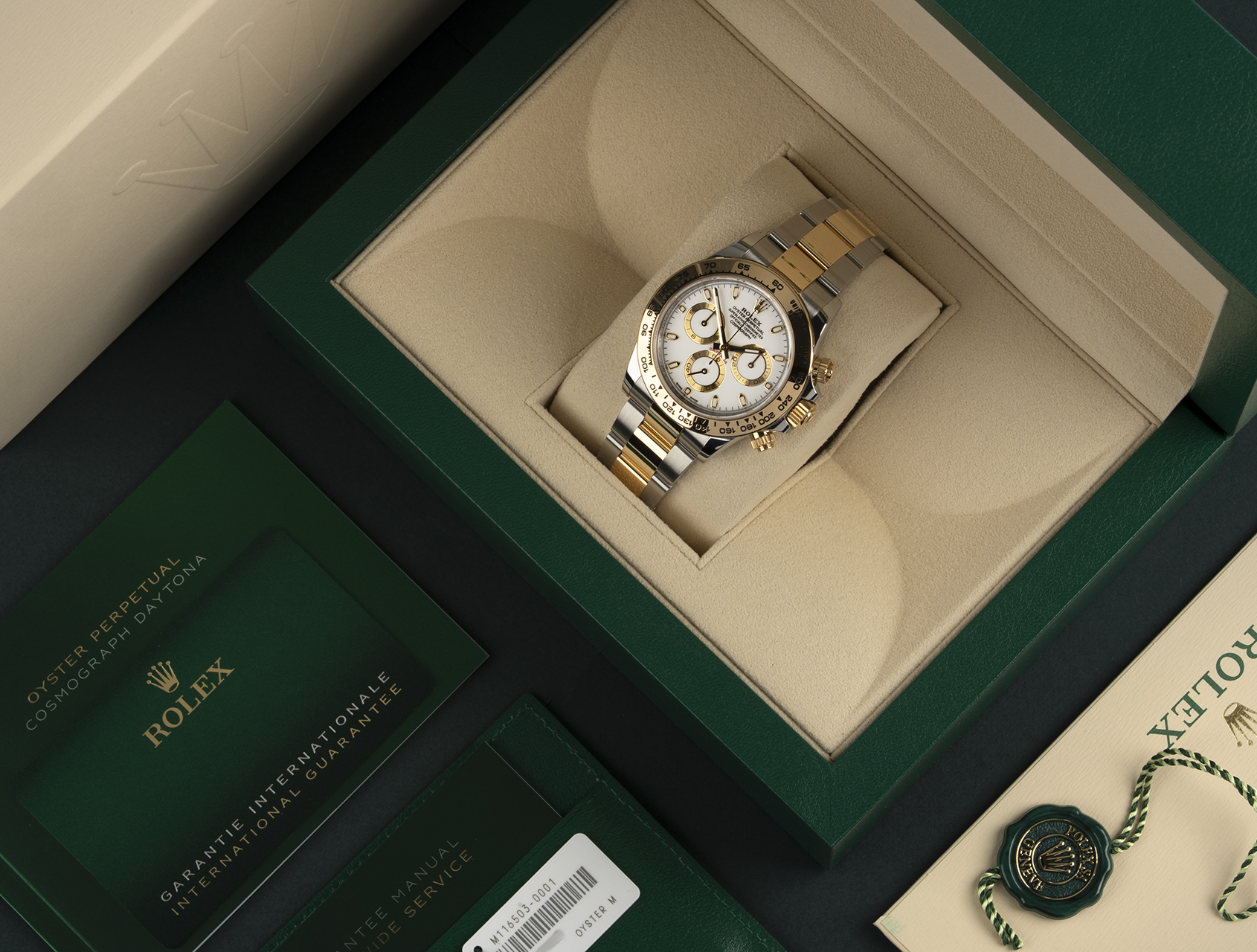 Accompanied by its inner and outer Rolex box, Cosmograph instructions booklets, both swing tags and its Rolex international warranty dated May 2021. Under warranty for 2 years.