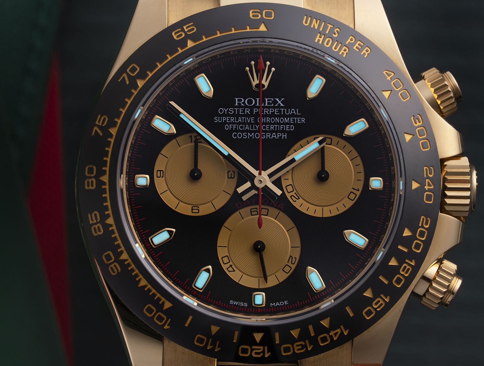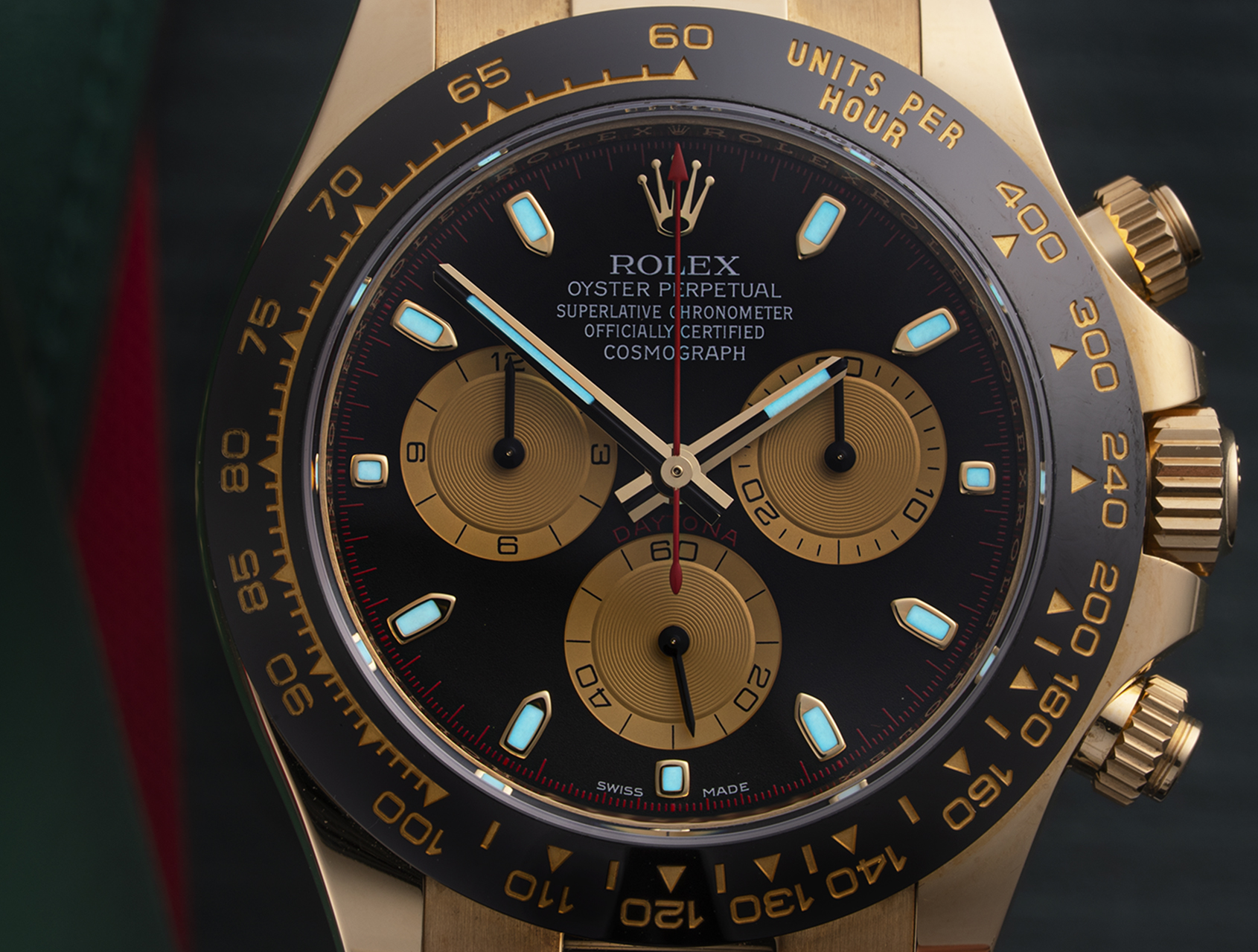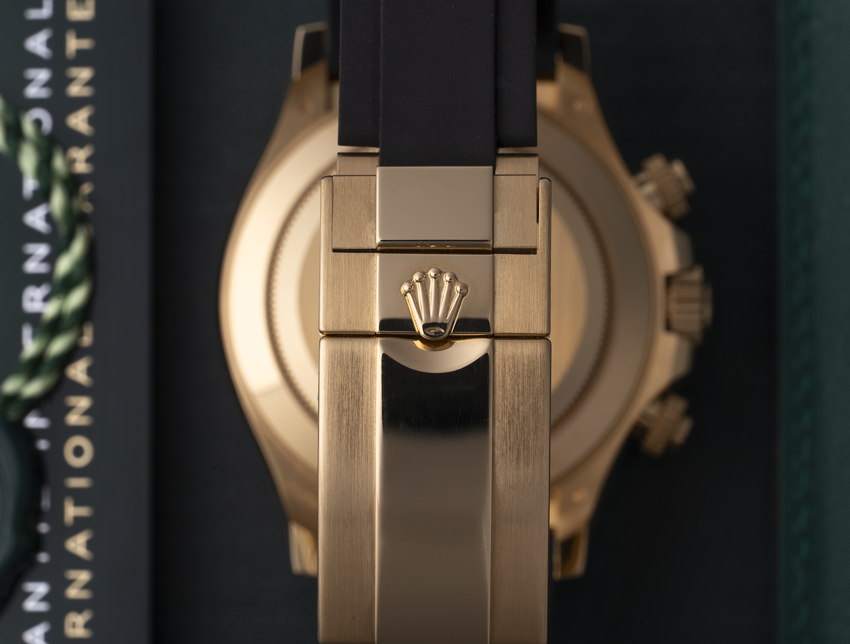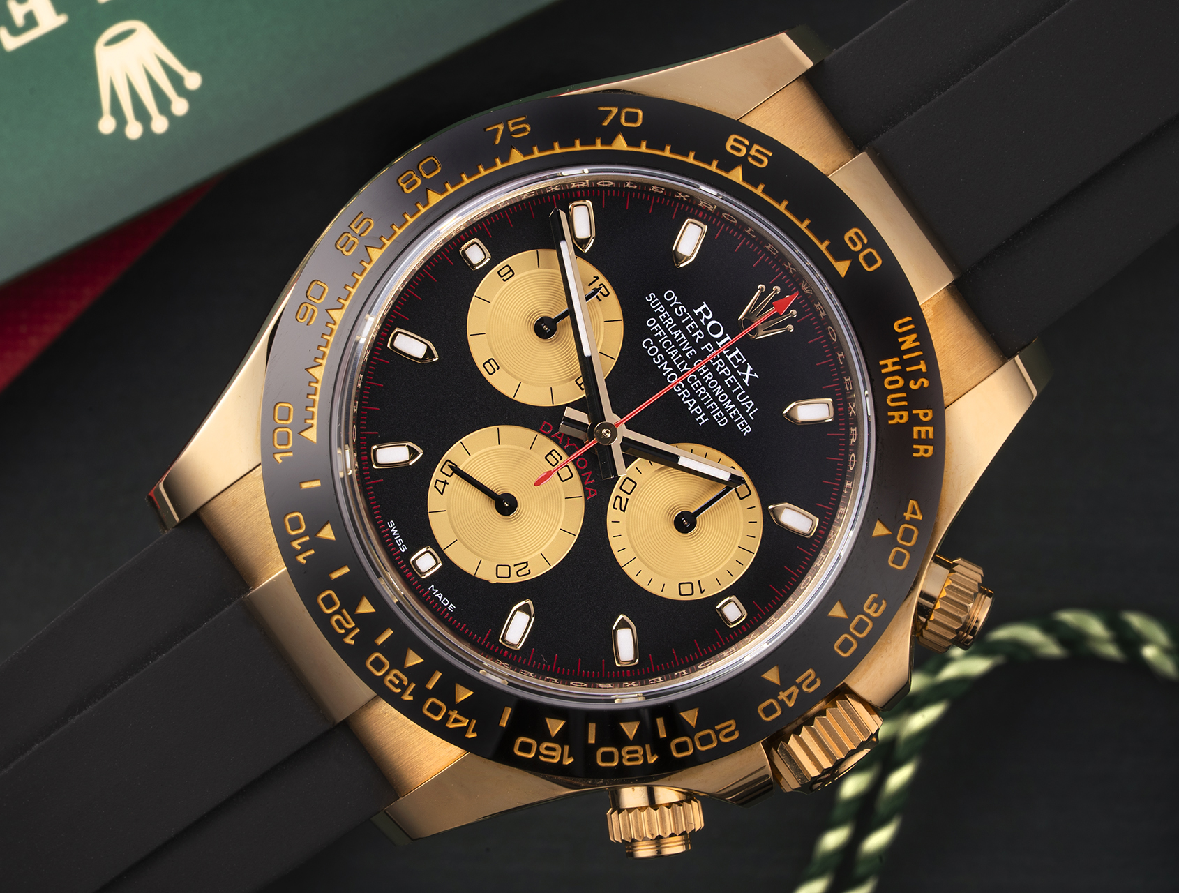The solid 18ct yellow gold case is paired with the excellent and hugely versatile Oysterflex bracelet with integrated titanium blade, and black/gold Cerachrom bezel. Powered by the Rolex developed self-winding chronograph calibre 4130.