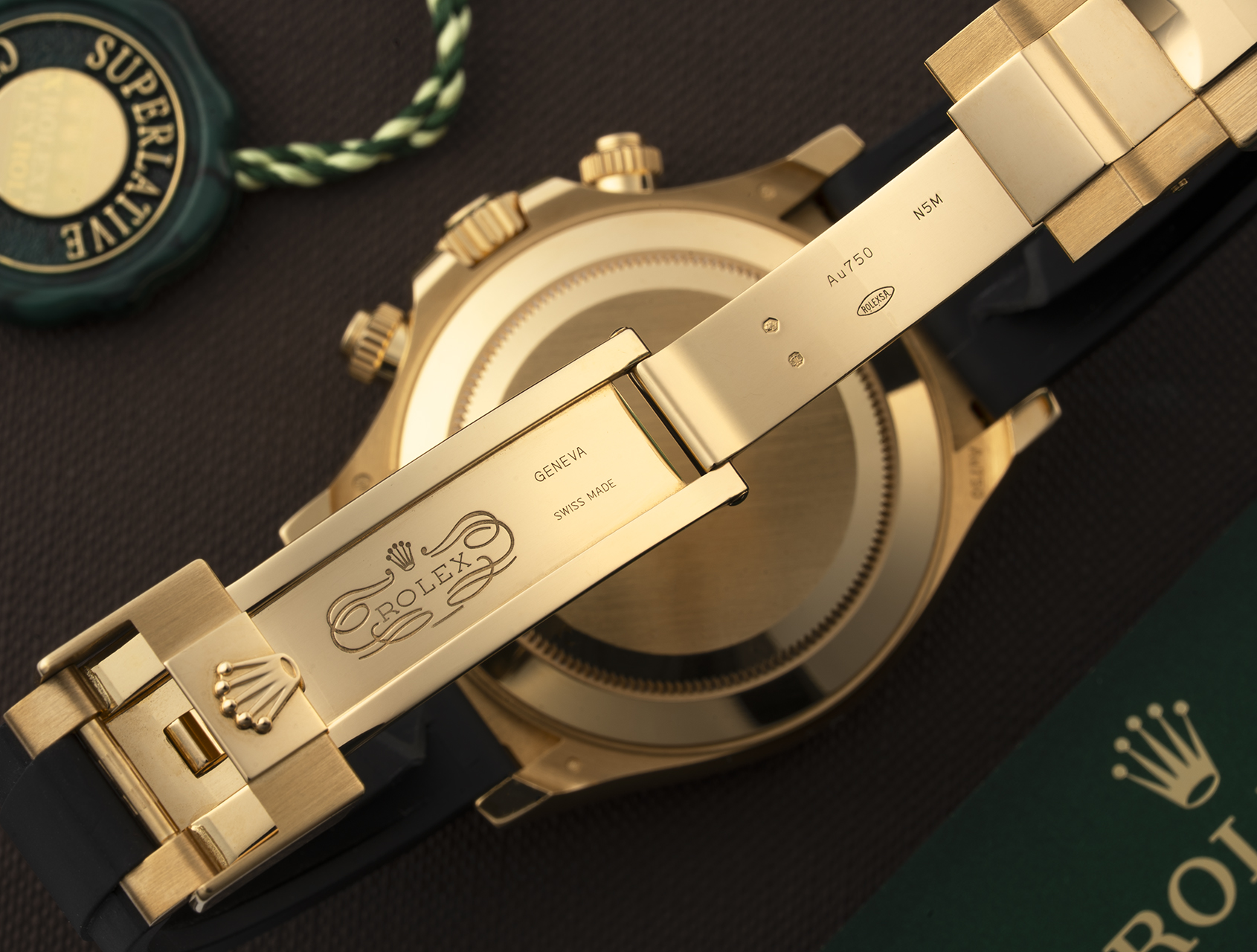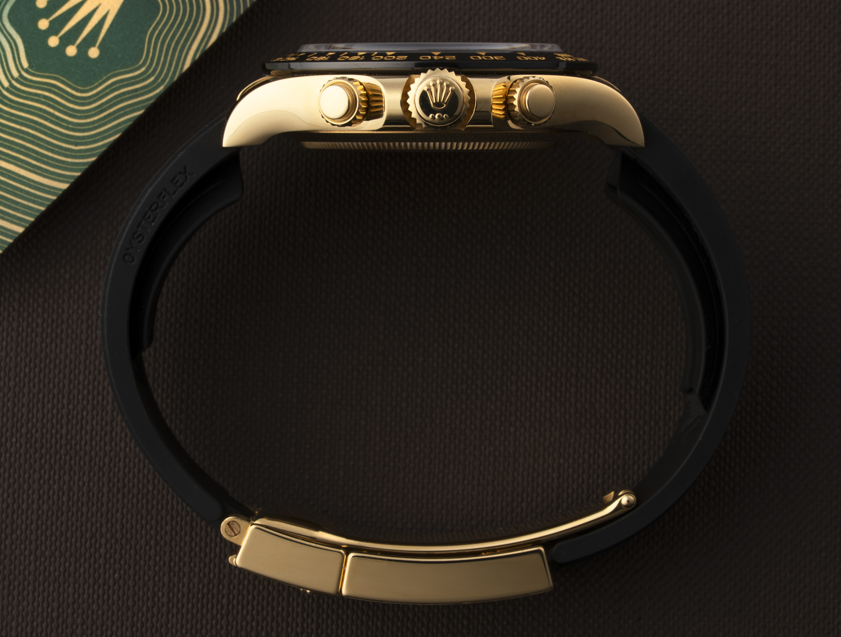The solid 18ct gold case with black Cerachrom racing bezel is fitted with the brilliantly versatile rubber Oysterflex bracelet with integrated titanium blade, and gold Fliplock clasp. Powered by Rolex's self-winding chronograph calibre 4130, and waterproof to 100m. Presented with its Rolex box, both swing tags and Rolex warranty card dated 15 Oct 2021.